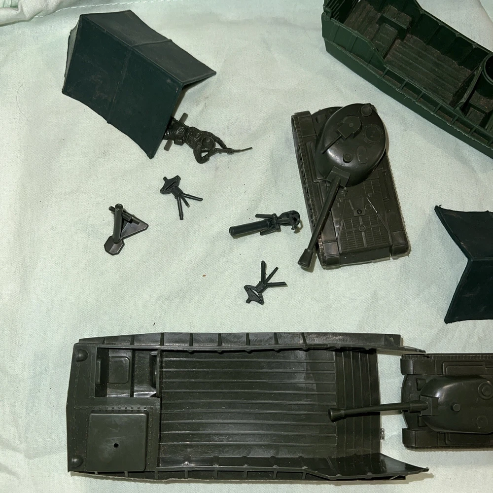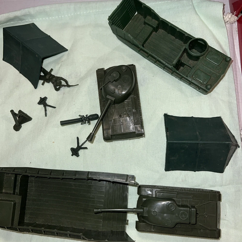 This vintage WWII Battleground playset includes two tanks and various soldiers. Although the carriers are missing some parts, this playset still offers a unique and historical addition to any collection. The plastic material used in its construction ensures durability and long-lasting enjoyment for play or display. The set is from 1995, making it a rare find for collectors of toy soldiers. Whether you are a history enthusiast or a toy collector, this playset is sure to impress.