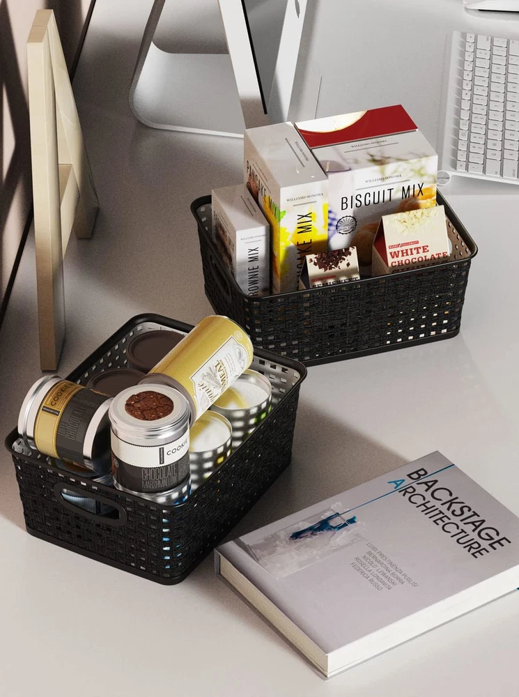 6 pack black plastic organizer basket, weave wicker storage organizer basket, perfect to service for kitchen/ bathroom/ classroom and so on, outside dimensions: 10" length x 7.5" width x 4" height Simplify plastic storage baskets are hassle-free stack able when not in use for maximum space utilization, and its combined tote allow you to move them with ease. Take it wherever you need storage. For convenient storage basket that are built with the sturdiness to give you years of service . The basket durable translucent plastic body with wicker design are built to last from premium grade materials The polypropylene plastic wicker storage basket are great for clothing, linens, bath and beauty products, magazines, etc. Versatile design and features to organize any space in your home, dorm room or office We adhere to the best product delivery and the most uncompromising quality. The trust placed by our discerning customers earned over the years. Fulfillment of our customer's need are core of our vision.