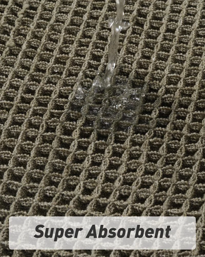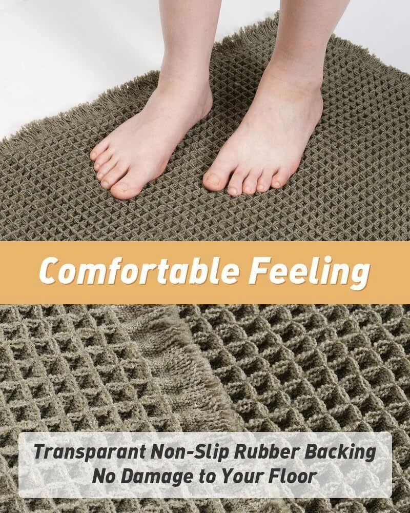 Upgraded Waffle Desgin: This boho bath mat is power-loomed with upgraded yarns-Integrating decoration and durability. The heavier and thicker threads are applied to make sure the pattern will be more solid and compact- NEVER OUT OF SHAPE! Great Water Absorption: Double layer of deep waffle texture absorbs water instantly and more breathable. In addition, the yarns we use is inherently absorbent-it absorb water like crazy. This absorbent bath mat can soak up the water and keep your floor dry like a giant sponge, and protect your feet from the cold floor. Clear Rubber Backing: This non slip bath mat is designed with clear rubber backing(HMA-Hot Melt Adhesive, invisible but touchable). This bathmat firmly grips the ground to prevent you and your families from falling. Comfortable and Soft: Three-dimensional waffle design combined with flexible yarns make the bathroom floor mat softer and cozier. Bring you a comfortable underfoot feeling. Enjoy a comfort space when you finishing shower. Easy to Maintain: Machine washable bathroom rugs provide convenience in your daily life. Recommend gentle mode,cold water. Or just shake the dust off from the bath rugs for simple cleaning. Size 17" x 60" Material Polyester Weave Type Machine Made Pile Height Low Pile Construction Type Machine Made Back Material Type Rubber Color Green Indoor/Outdoor Usage Indoor Product Care Instructions Machine Wash, Hand Wash Only Pattern Waffle Special Feature Absorbent, Lightweight, Quick Dry, Non Slip, Washable Room Type Entryway, Bathroom, Kitchen, Bedroom, Hallway Product Dimensions 60"L x 17"W Rug Form Type Runner Style Boho Occasion Housewarming Seasons Winter, Summer, Fall, Spring Item Weight 1.46 pounds