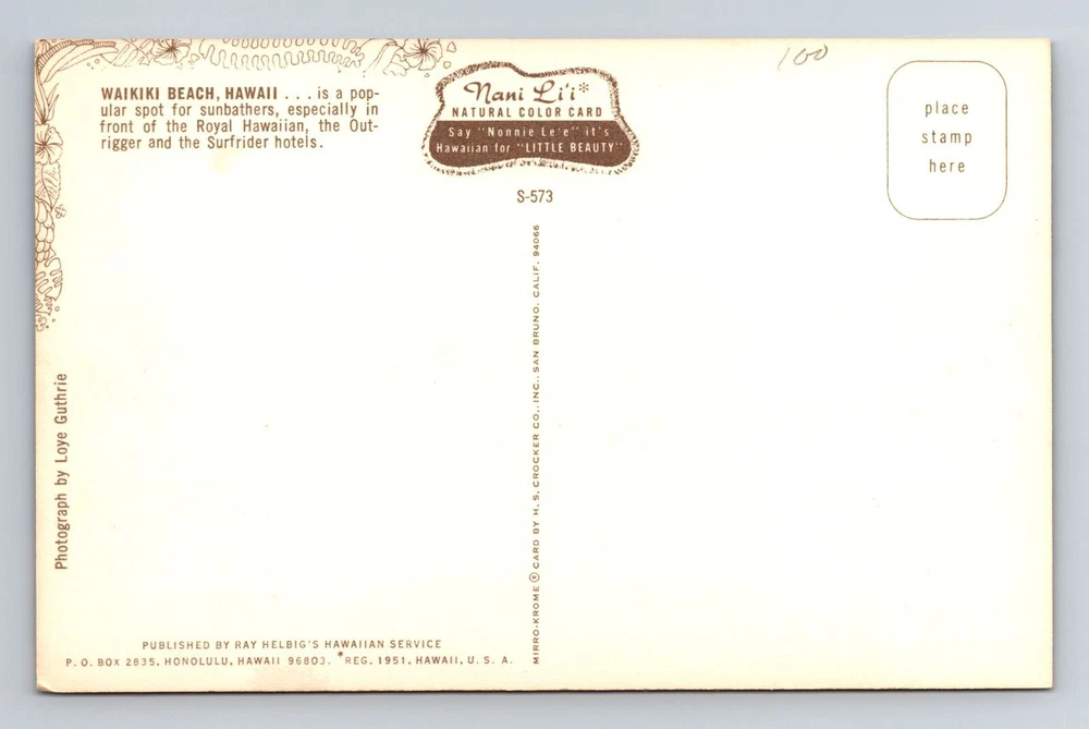 Postage Condition: Unposted Type: Printed (Lithograph) Country: USA Country/Region of Manufacture: Unknown City: Waikiki Beach Subject: Cities & Towns Region: Hawaii Original/Licensed Reprint: Original Theme: Cities & Towns Era: Vintage Unit of Sale: Single Unit