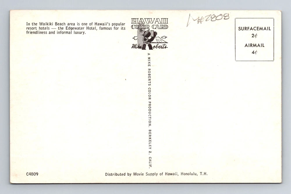 Waikiki HI-Hawaii, Edgewater Hotel, Advertising, Antique Vintage Postcard