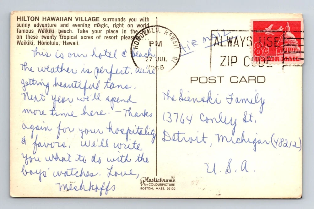 Waikiki HI-Hawaii, Hilton Hawaiian Village, Antique, Vintage c1968 Postcard