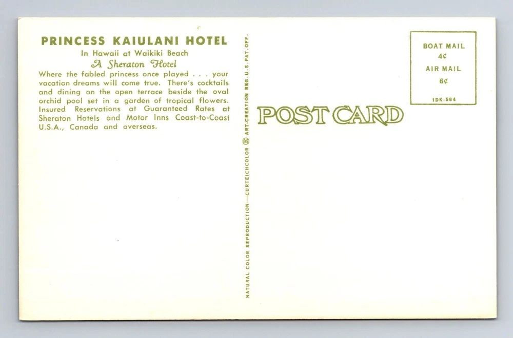 Waikiki HI-Hawaii, Hotel Princesa Kaiulani, recuerdo, postal vintage