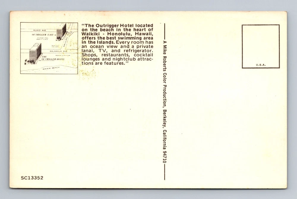 Waikiki HI-Hawaii, The Outrigger Hotel Advertising, Vintage Postcard