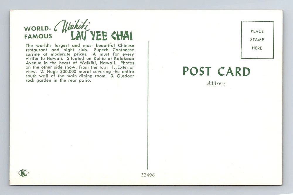 Waikiki HI-Hawaii, World Famous Lau Yee Chai, Vintage Postcard