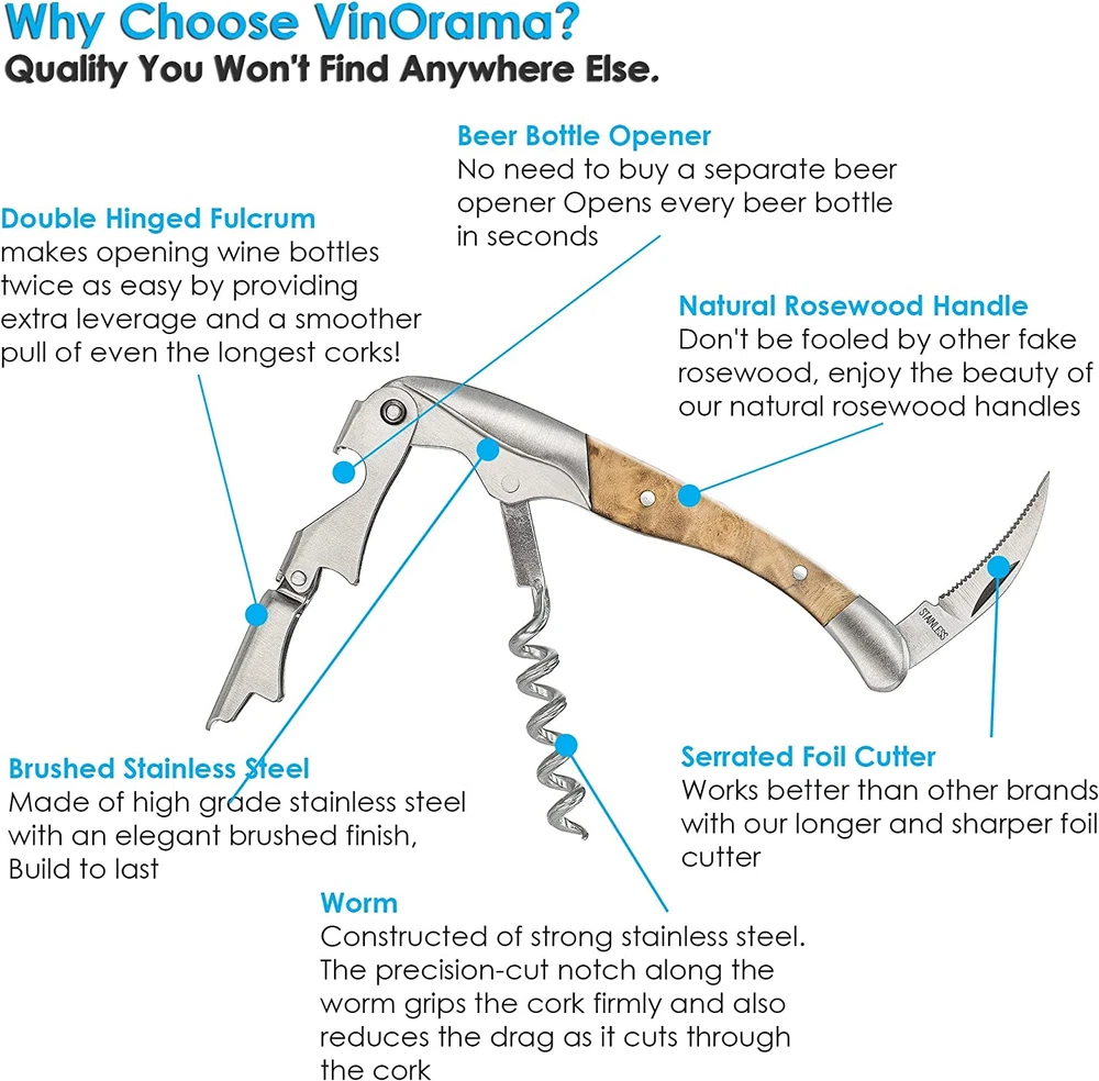 Store New Arrivals Add to Favorite View Feedback Contact Waiters Corkscrew Wine Opener Rosewood Handle 3-In-1 Beer Bottle Opener and Foil Cutter, the Best Choice of Professional Waiters and Bartenders around the Globe Description Is Customizable? No Color Rosewood Material Stainless Steel Material Type Stainless Steel Item Weight 3.2 ounces Is Customizable No Finish Types Stainless Steel Finish Type Stainless Steel Product Dimensions 5"L x 1.2"W Item Dimensions L x W 5"L x 1.2"W PRICE is going up soon buy as much as you can NOW!!!!! AN ESSENTIAL TOOL FOR EVERYBODY! – Our 3-1 corkscrew and bottle opening gadget is the ideal solution that can be used by both professionals and home users, as it is practical, durable and extremely easy to use! SLEEK & MODERN DESIGN! – With a comfort rosewood grip handle and a sturdy, heavyduty, stainless steel body, this corkscrew wine opener and foil cutter is much more than a necessary accessory; it’s an elegant, state-of-the-art possession! SUPERIOR QUALITY & CONSTRUCTION! – We, at VinOrama, make a point of using nothing but premium stainless steel and up-to-date production processes for our all-in-one corkscrew openers, to make sure that they can last you a ! NEVER BREAK A CORK AGAIN! – Thanks to our precision-cut notch along the worm that grips the cork securely and reduces the drag as it effortlessly cuts through the cork! 100% RISK-FREE PURCHASE! – Our multi-functional accessory is the best product your money can buy – and we are so certain it is, that we are offering you an astounding money back for it! Finally!! A Premium Quality Wine Opener that Really Works!! Are you looking for a professional, yet affordable corkscrew wine opener? Are you in search of a sturdy, trustworthy tool that can do multiple jobs at once? If yes, look no further! VinOrama has the tool you are looking for! The Perfect Choice For Wine Lovers Around The Globe! With a specifically designed, steel worm that will effortlessly remove all kinds of corks in a few turns and a round, serrated foil cutter that will quickly and precisely cut any foil, this unique product is a bartenders, waiter’s or sommelier’s absolute best friend! Excellent Design & Craftsmanship! When you are selling in such a demanding market, there is a handful of things that can make your clients coming back for more; quality materials is one of them. Our stainless steel and rosewood multi-purpose gadget, that won’t rust after a few uses, is the proof that we don't compromise our quality over quantity! Elegant & Classy Gift Packaging! Our 3-1 waiter corkscrew makes an exceptional gift for wedding, anniversaries or any special occasion. It’s the best gift idea you can think of! Your Satisfaction Is Guaranteed! VinOrama personally guarantees their Waiters Corkscrew will last a ! But if you aren't 100% happy with your purchase, we are offering you a – although we’re fairly certain that you won’t have to use it! Enjoy better wine opening experience for the rest of your life. Click ''add to cart'' now and Order yours new. ABOUT US We offer the best prices around on high quality products. Our E-store includes media such as books, movies, music and games while offering electronics, toys, sporting apparel, clothing, tools, general home, garden items and more. SHIPPING We are always working hard to ensure your package arrives as soon as possible. Please understand that some factors like weather, high postal traffic, and the performance of shipping companies are outside of our control. We offer free shipping to the lower 48 states and ship within 2 business days of payment, usually sooner. We do not accept P.O. Boxes. Please provide a physical address. For shipping outside of the continental USA, we only use eBay's Global Shipping Program.The item is shipped to KY and then sent to the rest of the world. International customers are responsible for all duties and taxes. Continue to check out in order to calculate costs for shipping the item to your country. Messages regarding eBay's Global Shipping Program MUST be directed at eBay EXCLUSIVELY. RETURNS We offer a 30-Day Return Policy on items which you are not completely satisfied with. You have the option for a full-refund or an exchange of the item. No returns are available on items shipped outside of the USA. PAYMENT We accept PayPal. CONTACT US This page content is yet to come Please ad us to your favorite seller and visit again later Thank You CUSTOMER SATISFACTION We try our very best to make sure every customer is completely satisfied. If there's a problem, message us! We're happy to help. WE ACCEPT Copyright © 2021 AutoDS. | All Rights Reserved