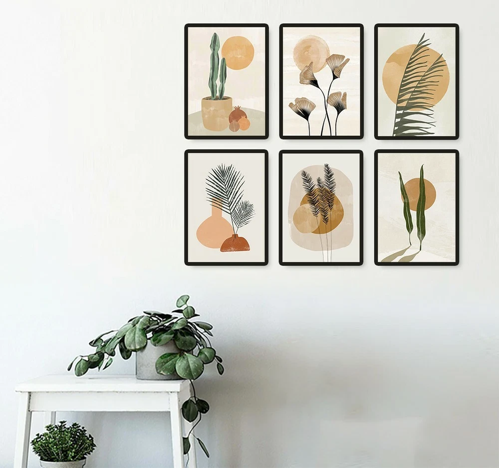 Set of 6 each 8.5x11 inch unframed Boho Minimalist Abstract Palm Frond Cactus Plants Art Prints printed on cardstock. Great for a housewarming or baby shower gift. These cute prints will look great in a nursery or kid's room.