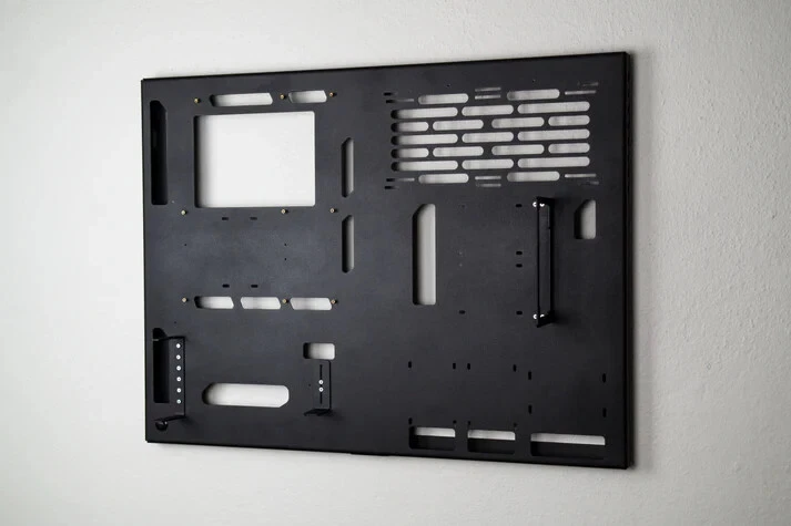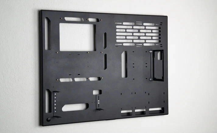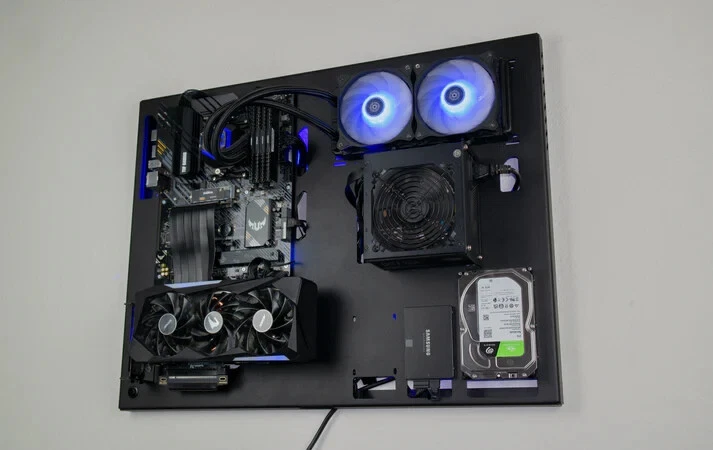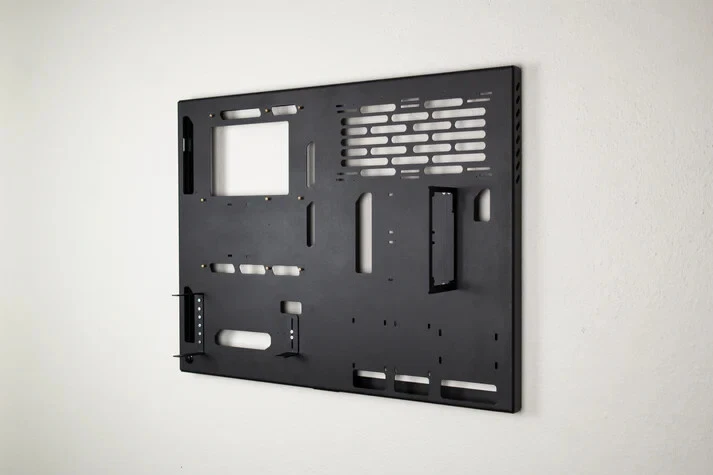ABK Wall Computer, Computer Wall Mount, Space Case, Open Case, Full ATX, Open Air Computer Case *Plexi Cover Panel Included* Dimensions: Width: 27" (69cm) Depth: 1.18" (3cm) Height: 20.8" (53cm) Allows for a full sized ATX power supply- also still supports SFF PSUs. Supports 2x SSD. 1x HDD Compatible with 120, 140, 240, 280, 360mm liquid coolers. Supports 120mm and 140mm fans. Made of steel. Powder coated. Only suitable for Mini ITX, Micro ATX, Full ATX motherboards. 1x Vertical card holder. 1x GPU Anti-sag 9x Motherboard mounting screw. 8x SSD mounting screw. 1x On/Off Cable and Button.