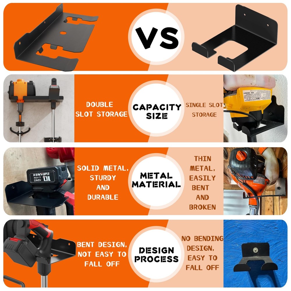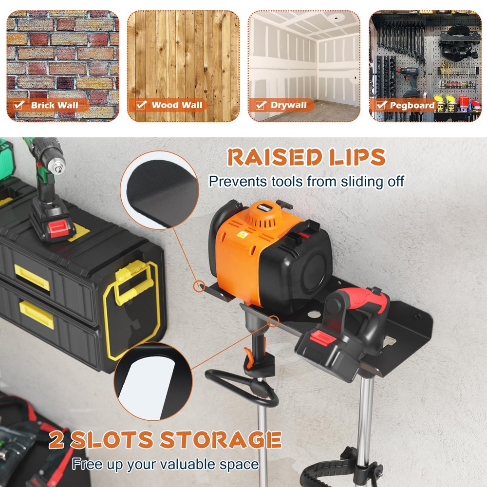 Garage Storage Organizer Trimmer Rack, 2 Slot Utility Storage Rack for Grass Trimmer, Hedge Trimmer, Garage Trimmer, Wall Mount Heavy Duty Weed Trimmer, Garden Tool Suitable for Shed, Garage, Workshop and Warehouse [Lawn Mower Tool Organizer]: Give your lawn mower, lawn trimmer a new foothold, using the heavy duty wall mount lawn trimmer holder can help you save and all your commonly used tools, organize your messy workbench, and find the tools you need without wasting time [Utility Storage Tool Rack]: Our utility storage rack is perfect for organizing garden tools such as lawn mowers, trimmers, weed eaters. Perfect for use in garages, tool rooms, workshops, warehouses, sheds, shops [Heavy Duty Holder Rack]: Made of heavy duty metal steel, the joints of the frame are reinforced and welded, the tool holder are stronger to prevent the storage rack from breaking easily and protect your tools [Organize Your Space]: There are 2 card slots to the lawn mower. Warm Tips: Please pay attention to the size of the shelf and whether it can your tools. This is a flexible wall solution that frees up extra storage space in garage, shed storage areas [Easy to Install]: The trimmer stand includes 1 bracket, 4 screws, and 4 expansion tubes. The wall mounted lawn mower stand can be quickly installed on drywall, concrete, brick wall, wooden wall, just on the wall, place the studs, and tighten the screws