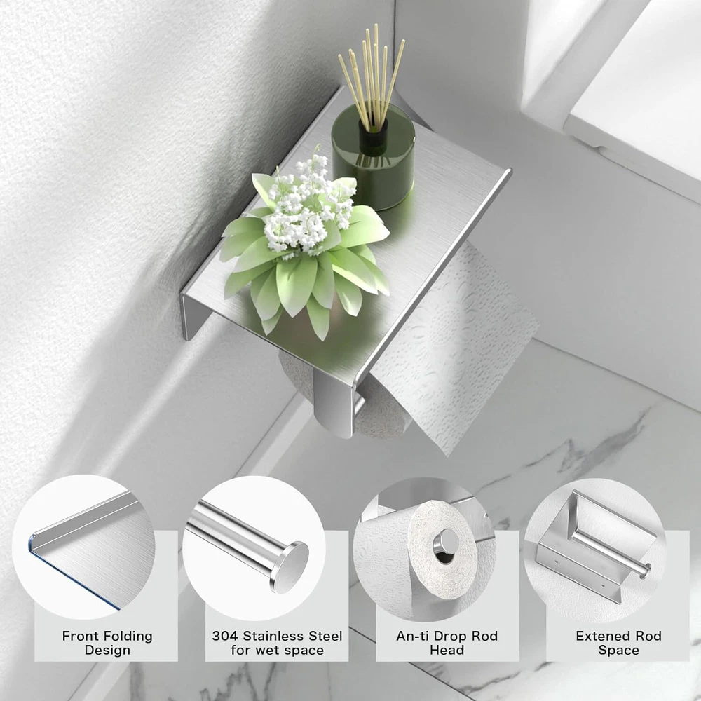 Wall Mount Brushed Nickel Toilet Paper Holder with Shelf for Bathroom 【SPECIAL FRONT FOLDING DESIGN】Toilet paper holder with shelf: Wide space on the toilet paper shelf allows you to put some bathroom accessories such as phone, small plants, perfume, wipes...etc. Special front folding design to prevent the slipping of everything you put 【EXTENDED ROD SPACE】We lengthen the space between wall and rod to make sure bathroom toilet paper holder fits BIG size paper towel. If you are a fan of BIG paper towel, choose ASTOFLI toilet roll holder without hesitation 【TWO EASY INSTALLATION OPTIONS】 1) Self adhesive toilet paper holder no drilling: Strong adhesive pad to help you stick the holder on anywhere you want without damaging it. 2) Drilling toilet paper holder wall mount: For uneven surfaces, drill and use screws for installation. Two installation options are space-saving and good for narrow bathrooms 【THREE UPGRADE POINT】1) ASTOFLI rv toilet paper holder is made of premium material - rustproof SUS304 stainless steel 2) Reduced product weight to ensure the firmness of self-adhesive and prevents toilet paper holder from falling off the wall 3) Excellent workmanship creates the sleek brushed nickel toilet paper holder Shipping We offer FREE shipping on all orders! We ship within Three business days of payment, usually sooner. We use a selection of shipping services such as UPS, FedEx, USPS etc. We only ship to the lower 48 states, no APO/FPO addresses or PO Boxes allowed. Local pickups and combined shipping options are not provided at this time. Return You can return a product for up to 30 days from the date you purchased it. Any product you return must be in the same condition you received it and in the original packaging. Please keep the receipt. Payment We accept payment by any of the following methods: PayPal Please pay as soon as possible after winning an auction, as that will allow us to post your item to you sooner! Feedback Customer satisfaction is very important to us. If you have any problem with your order, please contact us and we will do our best to make you satisfied. Contact Us If you have any queries, please contact us via ebay. We usually respond within 24 hours on weekdays. Please visit our eBay store to check out other items for sale! Thank you for shopping at our store.