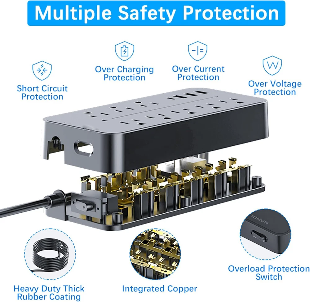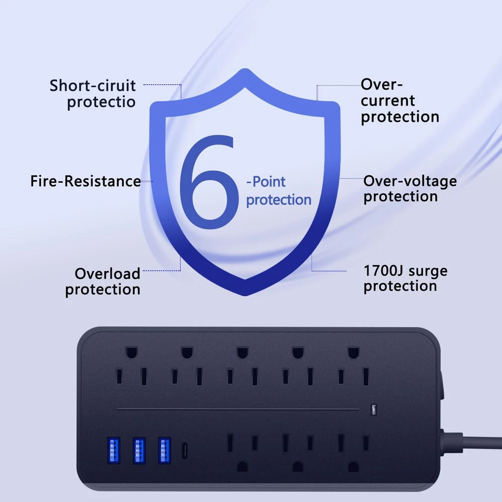 Wall Mountable USB Surge Protector Power Strip with USB Ports 8 AC Outlet Plugs Features: 【12 In 1 Surge Protector power strip with USB】The power strips surge protectors with 8 AC power outlets & 4 USB charging port,which can support 12 electric devices simultaneously,3.77 Feet Heavy Duty extension cord(2000W/10A),18 AWG pure copper. Wide range voltage design, can be used on 110v to 250v circuit. 8 standard AC multiple plug outlet. 【Extension Cord with USB Ports】Extension cord with built-in USB and Type C ports, specially designed for all your multiple charging needs. Keep your devices powered safely and efficiently. 【High-grade Surge Protector】Our surge protector power strip safeguards your electronics against voltage fluctuations, surges, and spikes, making it an ideal power solution for home and office use. 【Powerful Flat Plug Power Strip】his power strip features a space-saving flat plug design that conveniently fits in tight spaces and behind furniture, ensuring maximum utilization of your outlets. 【Power Strips with USB Ports】With integrated USB and Type C ports, our power strip provides efficient charging for your smartphones, tablets, and more, eliminating the need for multiple chargers. Specification: Type:Surge Protector Power Strip Color:Black Material:ABS+Copper Power Rating: 2000W( 10A MAX) Surge Rate:1700J Cord lengt:3.77ft USB port:1Type C(10w)+3USB A (10W) AC outlets:8 Worldwide Trave:Yes (100-240V) USB Output: 5V 2A (10W max) Package Content: 1 x Surge Protector Power Strip Payment Delivery details Terms of sales Feedback Contact us Payment Immediate payment is required. Shipping will be arranged within 1 business day once payment is cleared. To uphold a shipping speed, your order will be processed almost immediately. If you change your mind after your payment is confirmed, we will do our best to cancel the order, however, we CANNOT guarantee the cancellation. Delivery details FREE SAME BUSINESS DAY MONDAY- FRIDAY SHIPPING FROM USA. No shipping on Weekends or US Public Holidays. No responsibility for any custom duty. We will ship your order to your Ebay Verified address provided. Please verify your address and make sure that it is your current address before making your payment. Any address change requests after your payment CANNOT be guaranteed. Shipping information will be updated when available. All of our products can be shipped internationally. To confirm the shipping rates to your country please refer to eBay's Shipping Tab above. Any brokerage, customs, and duty fees associated with international shipments are the customer's responsibility and are not included in our shipping fee. A phone number is required for the customs documents. Failure to provide one will result in delays. We do not include an invoice or any advertising materials with our shipments. Terms of sales We stand behind our items and offer 60 days warranty. All items are in new and working condition unless specified otherwise elsewhere in the description. All Returns - defective or otherwise - MUST BE PREAUTHORIZED to guarantee refund or exchange. Please contact us to get an authorization and return address. Buyer agrees to pay for the cost of re-shipment for undeliverable or wrong addresses. Buyer is responsible for Return Postage if return/replacement is not a result of our mistake such as wrong item. Replacement or Refund will be made upon receipt of the returned item. Please include tracking number so we can process ASAP. If you do not wish to wait for a replacement, please repurchase the item. Feedback We strive to provide the best products and services. Your positive feedback 5 stars DSR help us do better. If anything about your transaction did not meet expectations, please CONTACT US and give us the opportunity to make things right. We are always here to help. Contact us Please do not hesitate to CONTACT US . You can message 24/7 on eBay for all questions and inquiries. We will get back to you within one business days at the latest from Monday- Friday.