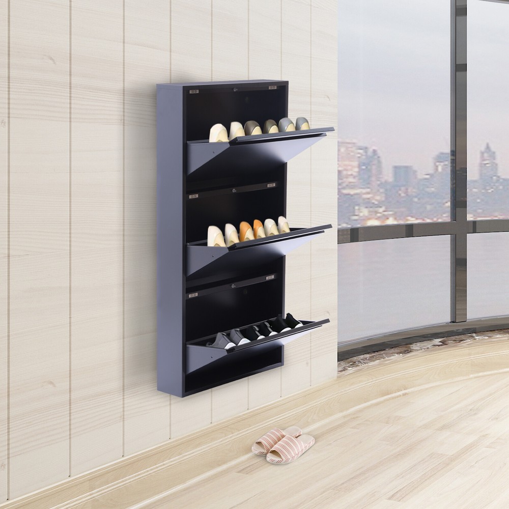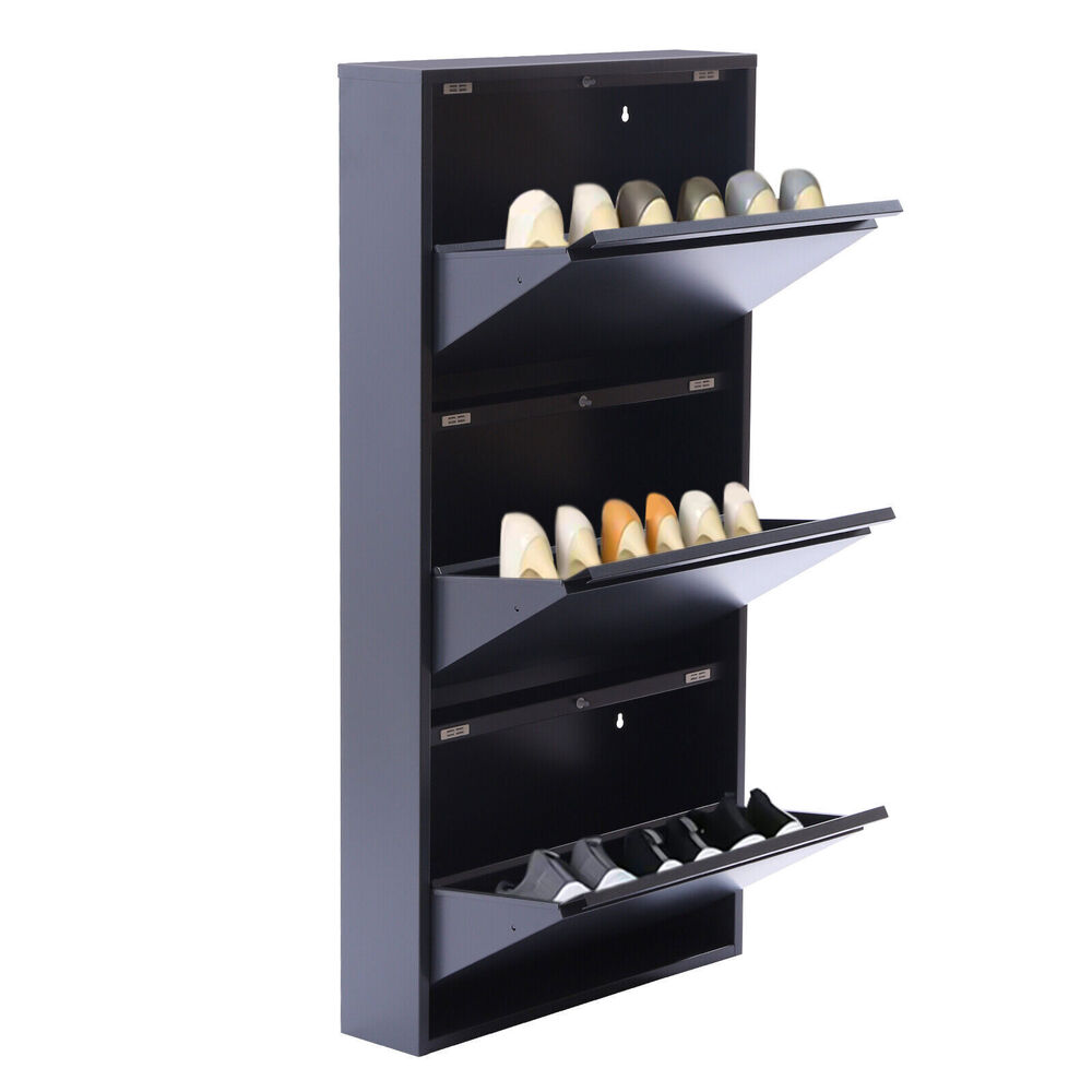 Specification Style: Modern Color: Grey Shape: Rectangular Number of Tiers: 3 Installation Type: Freestanding, Wall Mounted Material: Cold Rolled Steel Plate Thickness: 0.8mm/0.03inch Gross Weight: 13.5kg/29.76lbs Product Size: 50.5*12.2*103.3cm/19.88*4.8*40.67inch Package Size: 115*59*19cm/45.28*23.23*7.48inch Package Included 1* Shoe Cabinet Other Accessories for Installation 3 Drawer Shoe Storage Metal Cabinet - Wall Mounted Modern Shoe Rack-No-Assembly! Description Do you believe that? A small entryway can be turned into a storage treasure trove. If you don't believe it, you can try our shoe cabinet. The three-tier design of this shoe cabinet can hold up to 9 pairs of shoes and the wall-mountable installation can save more space in your entryway. Hurry up and take it home with you! Key Features High-quality Material: The shoe cabinet is made of 0.03inch thick cold rolled steel, which is tough and not easily deformed. And the inside of the back of the shoe cabinet is welded reinforcement plates to make the shoe cabinet last longer. Great Home Decor: In classic grey with a simple design, this shoe storage cabinet provides a sense of modernization, which enriches your entire entryway and gives your house a new look, showing off your lifestyle. Large Capacity: The shoe cabinet has 3 tiers and can store up to 9 pairs of shoes to meet your storage needs. When it is mounted on the wall, the spare bottom floor can also be used to store slippers, etc. Humanized Design: Its surface is smooth without burrs, and it will not scratch the hand. The corners of the frame are designed with rounded corners, so you will not be injured during use. Relieving Your Fatigue: This beautiful shoe cabinet guards the door every day and welcomes you home. It allows you to put away your exhaustion as soon as you get home and start enjoying leisurely home life by taking off your shoes. Organized Lifestyle: This shoe cabinet cleverly integrates shoe storage into life, placing it at the doorway to store your messy shoes, making it pleasing to the eyes as soon as you open the door, bringing you an organized lifestyle. Thoughtful Design: Each layer is equipped with a damping switch and rubber magnetic suction, which not only reduces noise and prevents your hands from being injured when opening and closing, but also enhances the sealing of the shoe cabinet. Tipping Bucket Design: The entire shoe cabinet Features a tipping bucket design for easy opening and closing, making it very easy to use. It also keeps dust out of the shoe cupboard. Space Saving: With a small footprint of 19.88*4.8inch at the bottom, it can be placed in every corner of the home. By using the doorway space wisely, even a small entryway can be turned into a storage treasure trove. Also, it can be mounted on the wall to save floor space. Easy to Clean: Its smooth surface makes it very easy to clean, all you need to do is wipe it down regularly with a dry cloth or wash away any serious stains. And the shoe cabinet is held in place with spring pins and is removable for easy cleaning. Avoiding Creases: This large capacity shoe cabinet can accommodate boots and medium boots, allowing them to stand securely or be placed at an angle to avoid wrinkles on the surface. Protective Shipping: In order to prevent the product from being damaged and bumped during transportation, we fill the package with anti-collision protection foam to protect your products to the maximum extent possible. Details Reinforced Shoe Hopper: The shoe hopper is reinforced on three sides, making it stable to open and close without wobbling. Top Platform: The top platform is spacious enough to hold keys, photo frames, etc., making it very practical. Pre-drilled Holes: There are four pre-drilled holes at the back of the shoe cabinet to allow you to fix the cabinet to the wall and prevent it from collapsing. Full Plate Layer: The layer rack is designed with a full plate, which can effectively prevent the ash on the bottom of the shoes from falling onto the shoes on the lower layer. At the same time, the full plate layer shelf places shoes more stably, and even high heels will not fall. Concealed Handle: The concealed pull handle is semi-circular. The curved shape is not only subtle and beautiful but also makes it easy to open and close the shoe cabinet without hurting your hands. Application It is suitable to be placed at the door, living room, or bedroom used to place slippers, casual shoes, high heels, boots, leather shoes, and other shoes, as well as some daily necessities such as keys, books, and umbrellas. It can be used as a bookshelf and storage rack. Installation 1. Place the shoe cabinet in the position where it is to be installed. 2. Mark the hole locations with a marker. 3. Punch the holes in the marked positions. 4. Insert the plastic expansion tube into the punched holes. 5. Screw the screws into the plastic expansion tube (halfway in first). 6. Align the shoe cabinet with the screw fixing holes and hang it. 7. Tighten the screws so that the back of the shoe cabinet fits snugly against the wall. 8. Check that the shoe cabinet is not loose. Specification Style: Modern Color: Grey Shape: Rectangular Number of Tiers: 3 Installation Type: Freestanding, Wall Mounted Material: Cold Rolled Steel Plate Thickness: 0.8mm/0.03inch Gross Weight: 13.5kg/29.76lbs Product Size: 50.5*12.2*103.3cm/19.88*4.8*40.67inch Package Size: 115*59*19cm/45.28*23.23*7.48inch Package Includedss 1* Shoe Cabinet Other Accessories for Installation Notes Please Notes that this is a slim shoe cabinet that can accommodate shoes up to 4.72inch in height and 12.2inch in length. Please allow the slight color difference caused by the shooting light and 1-3cm error due to manual measurement, and make sure you do not mind before ordering. Dear friend, Welcome to my store . Wish you have a nice day and happy shopping. If you have any questions or more information about promotion, please leave me a message and we will repl