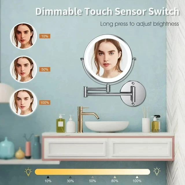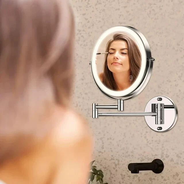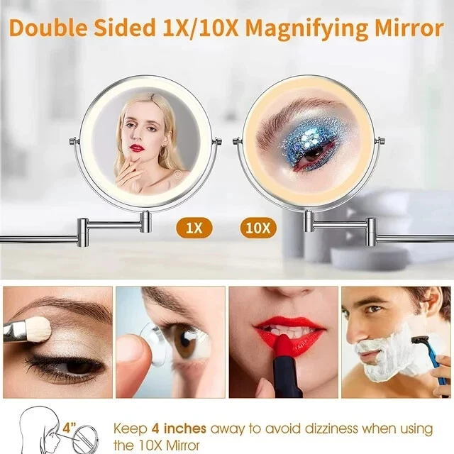 Wall Mounted Makeup Mirror, 8" Lighted Extendable 1x 10x Magnify LED Shaving