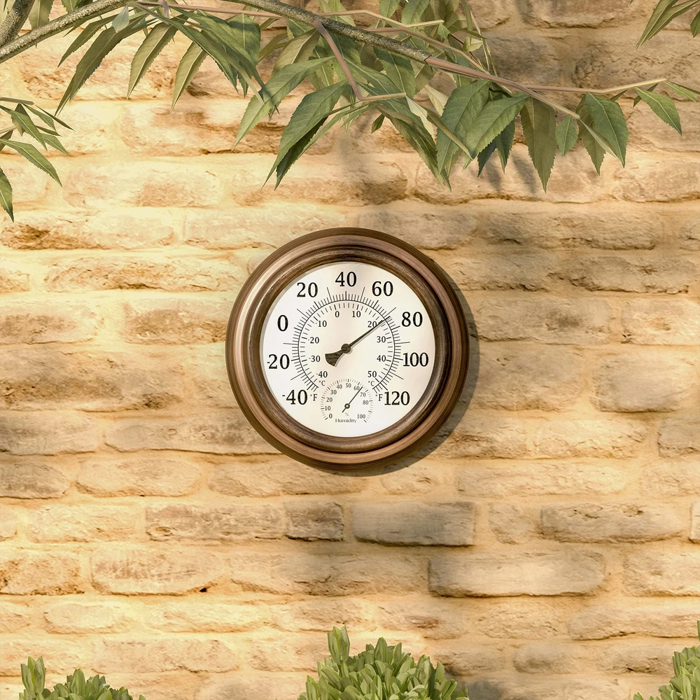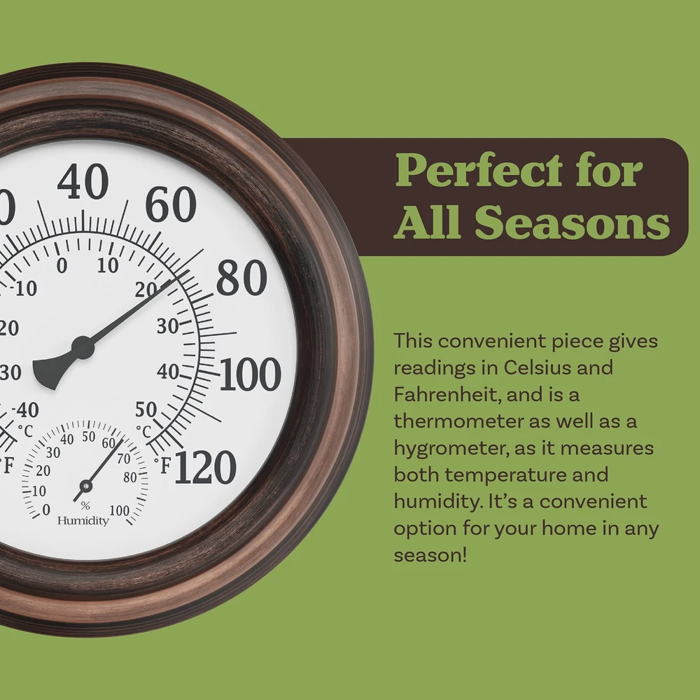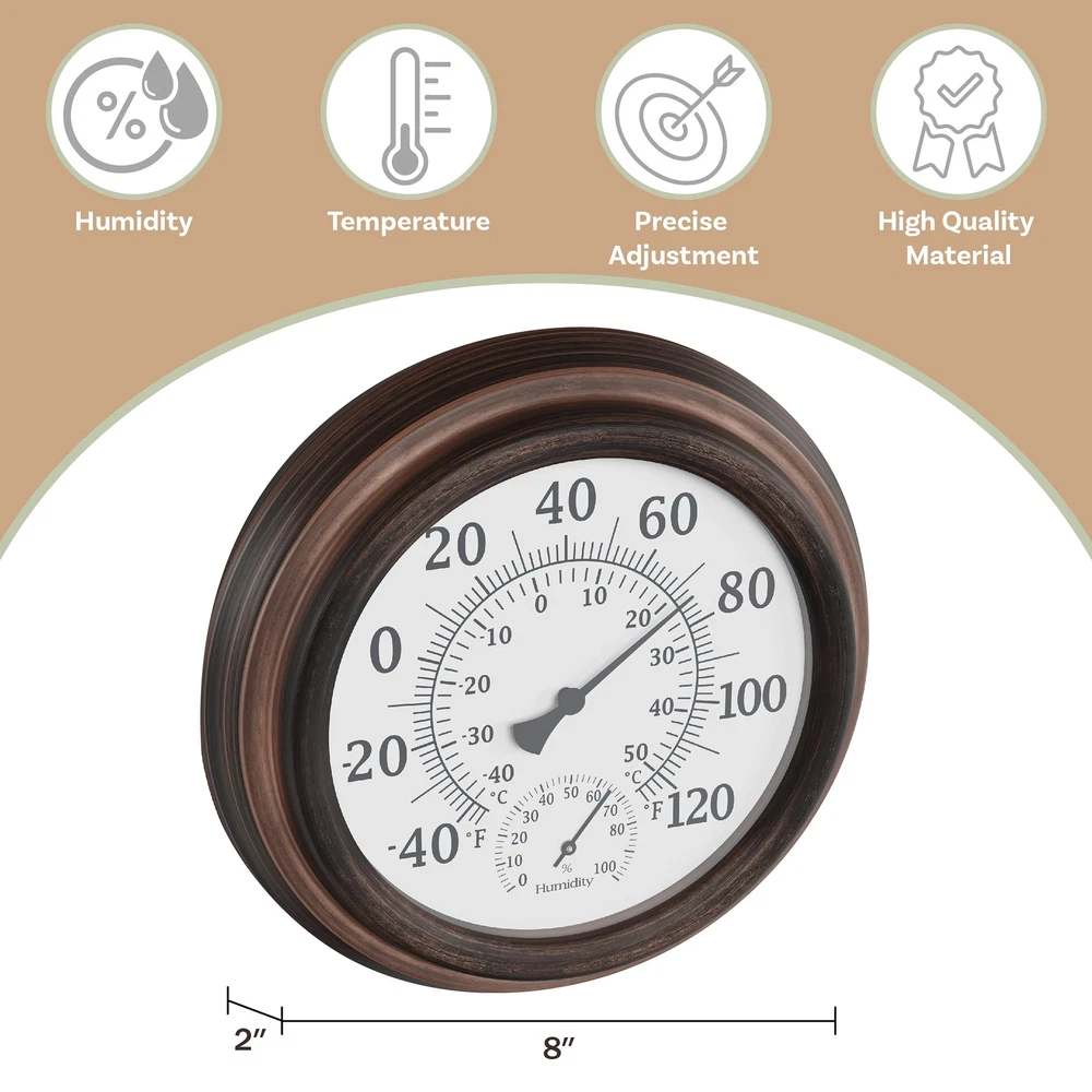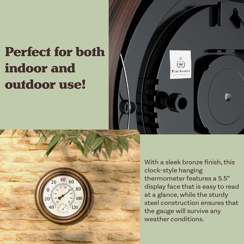 The Wall Thermometer is a necessity for any home! This convenient piece measures both temperature and humidity and is great to have in all seasons. With a sleek bronze finish, this clock-style hanging thermometer is a wonderful addition to any area of the home, indoors or outside; hang it on your patio, porch, deck, kitchen, or sunroom. Equipped with a 5.5” display face, you can easily read the temperature at glance, while the sturdy steel construction ensures that the gauge will survive any weather conditions. It’s an attractive and functional piece for your home! is committed to providing the consumer with the absolute best price and value on our entire line of products, which we ensure by applying a rigorous quality control process. br /> IMPORTANT: Avoid buying counterfeit products and transacting with unauthorized sellers. Look for our logo on the packaging for every one of our products. TEMPERATURE GAUGE FOR ALL SEASONS - This decorative clock-style outdoor thermometer gives readings in both Celsius and Fahrenheit. The handy built-in hygrometer measures and displays the humidity, so you are always ready for the weather in any season. ACCURATE READINGS - Designed with a precision coil, the outside thermometer calibrates automatically without batteries. Place the gauge in a shady area to get accurate temperature readings from -40-120 degrees Fahrenheit and -40-50 degrees Celsius. INDOOR/OUTDOOR USE - The wall thermometer is suitable for both indoor and outdoor use whether you hang it in the kitchen, by the pool, or on the deck. The gauge is easy to mount on a wall, post, or even on the side of a tree. ATTRACTIVE AND DURABLE - With a sleek hand-painted bronze finish, this hanging temperature thermometer features an easy-to-read 5.5-inch glass display face, while the sturdy steel construction ensures that the gauge can withstand most weather conditions. PRODUCT DETAILS - Materials: Steel Base and Glass Lens. Dimensions: (L) 8" x (W) 2". Color: Brushed Bronze.