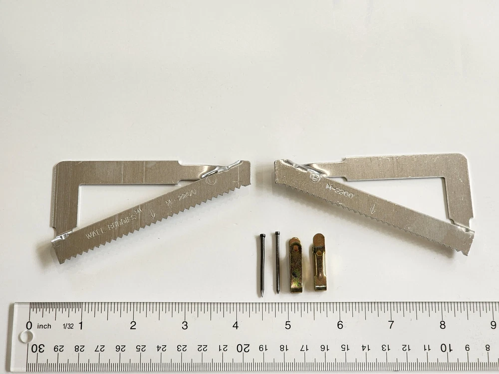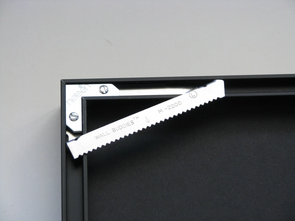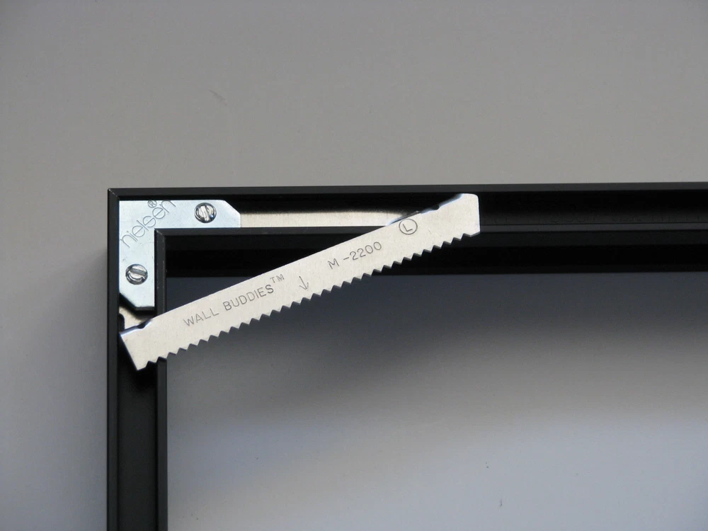 WallBuddies™ Self Leveling, Corner Hanging System for Metal Picture Frames No wire needed. Sawtooth hanger design allows for easy picture leveling. Pictures hang flush to the wall and remain level. ONLY for metal frames with a 3/16"x1/2" back channel and a minimum 11" in horizontal length. Designed for metal frames and slips into the metal frame back channel during assembly. Remove back plate for use. Weight rated up to 30 lbs. Packaged in unlabeled poly bags. Orders for more than one hanger will be bulk packed. Includes right & left mounting sawtooth bracket, pair of WB wall hooks w/nails, 2 frame bumpers. The weight specified is used as an identifier for comparative purposes only and are based on hangers nailed into wall studs. Please choose a weight rating that greatly exceeds the object being hung. > You are purchasing from a professional picture framer running a small family business. All products are stocked, photographed, and shipped by the Seller in the USA. >Shipping: USPS. We strive to ship within one business day after verified payment is received. Any free shipping offers apply only to locations in the USA and its protectorates. International buyers note you are responsible for your country's import fees including taxes and customs charges.