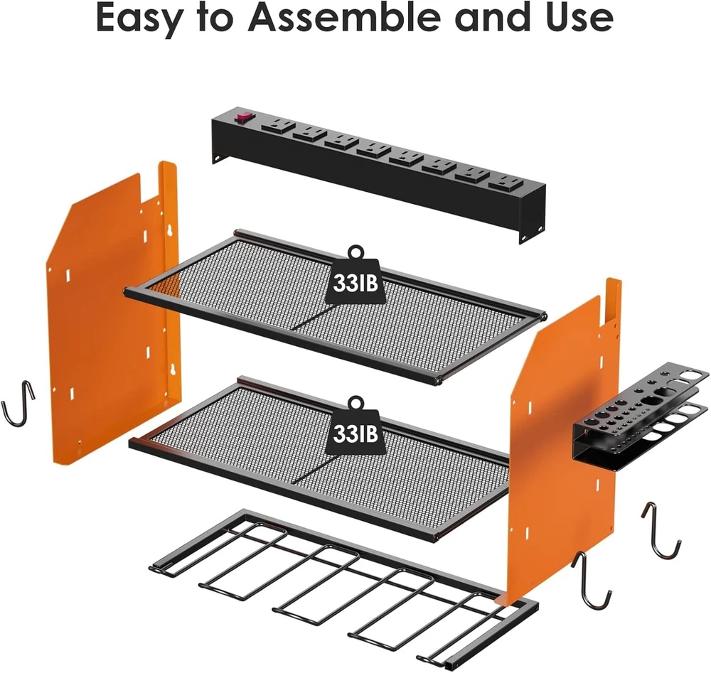 Set Power Tool Organizer Wall Mount with Charging Station. Garage 4 Drill Storage Shelf with Hooks, Heavy Duty Metal Tool Battery Charger Organizer. Shop Utility Rack with Power Strip Orange. Wall mount power tools organizer come with 4 slots, 4 hooks and drill bit rack, built-in power strip, double layer structure can keep rechargeable tools organized in the work area and save your bench space. The tools in the picture are for demonstration purposes only and are not included. Power tool organizer with charging station, come with 8 outlets. If you have a lot of rechargeable tools, you can charge everything right in the rack and avoid searching for sockets. 6ft power cord included. Very convenient for charging your tool batteries, All-in-one design and the metal power strip with surge protection of 1200J, Able to protect your device to a certain extent. Utility rack size: * * H:12in. Add a tool box on the side to store multiple types of gadgets - Commonly used drill bits, tweezers, screwdrivers, also equipped with four hooks to hang tools such as tape measures or wrenches. to increase the diversity of storage. Easy to assemble and mount on a peg board, If you need more storage space, you can connect the two shelves (or more) by screws. Each layer of the grid can support a maximum weight of 33IB. Made from heavy gauge steel.