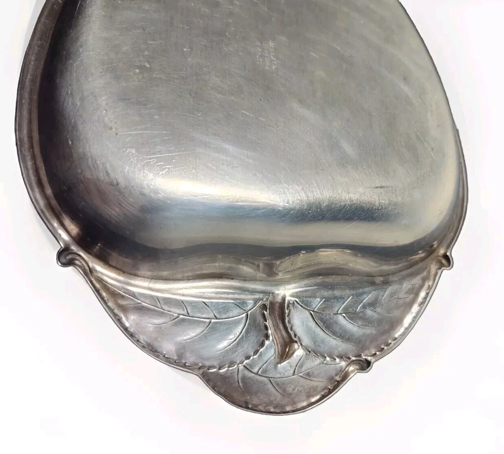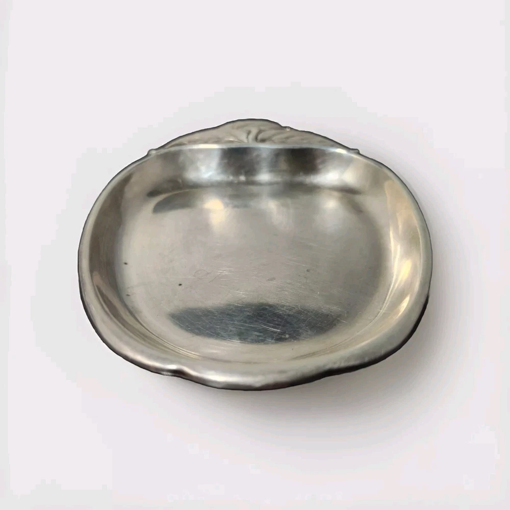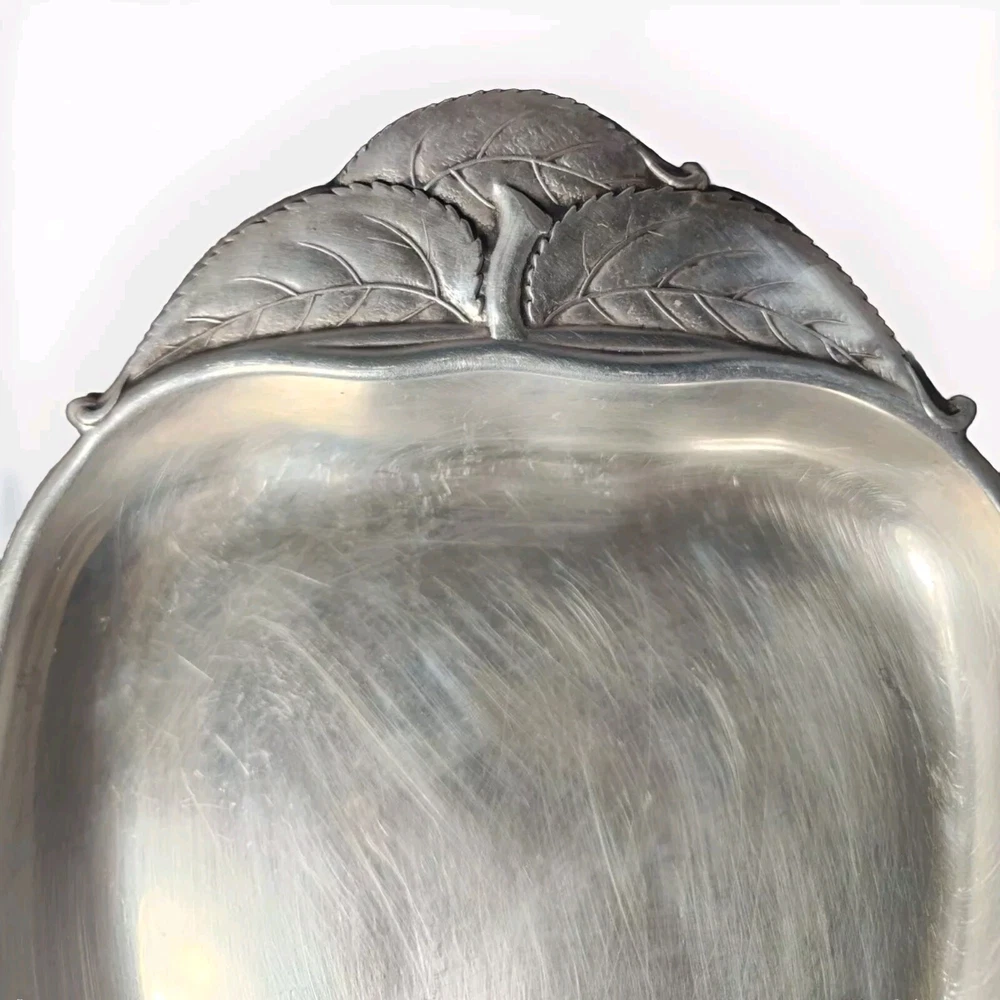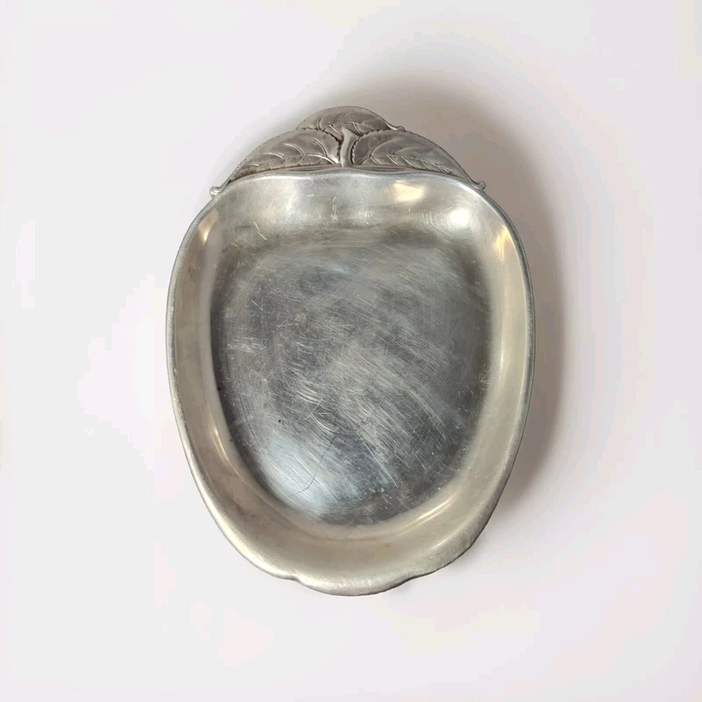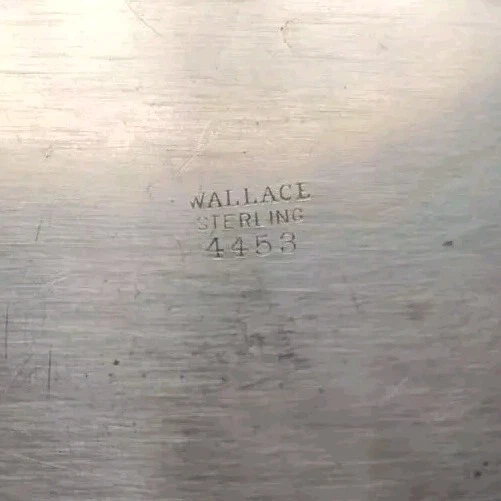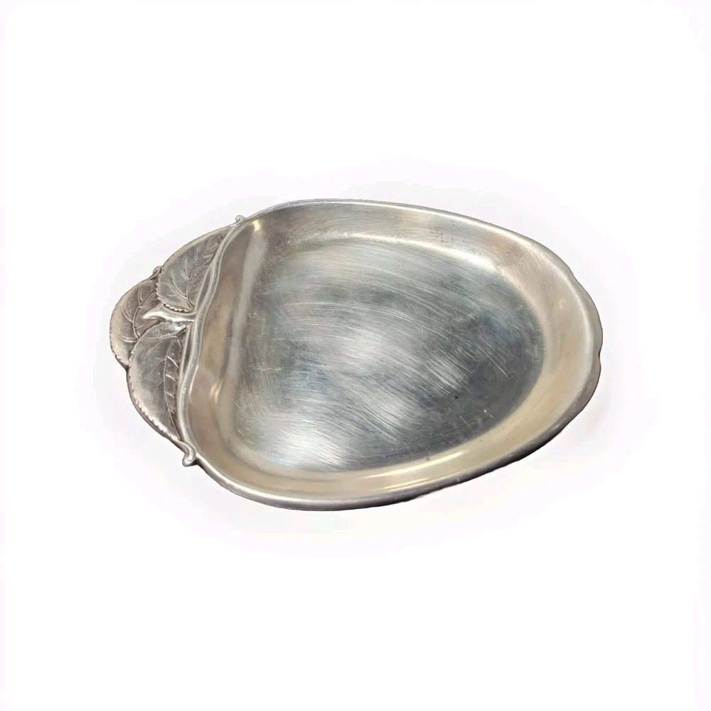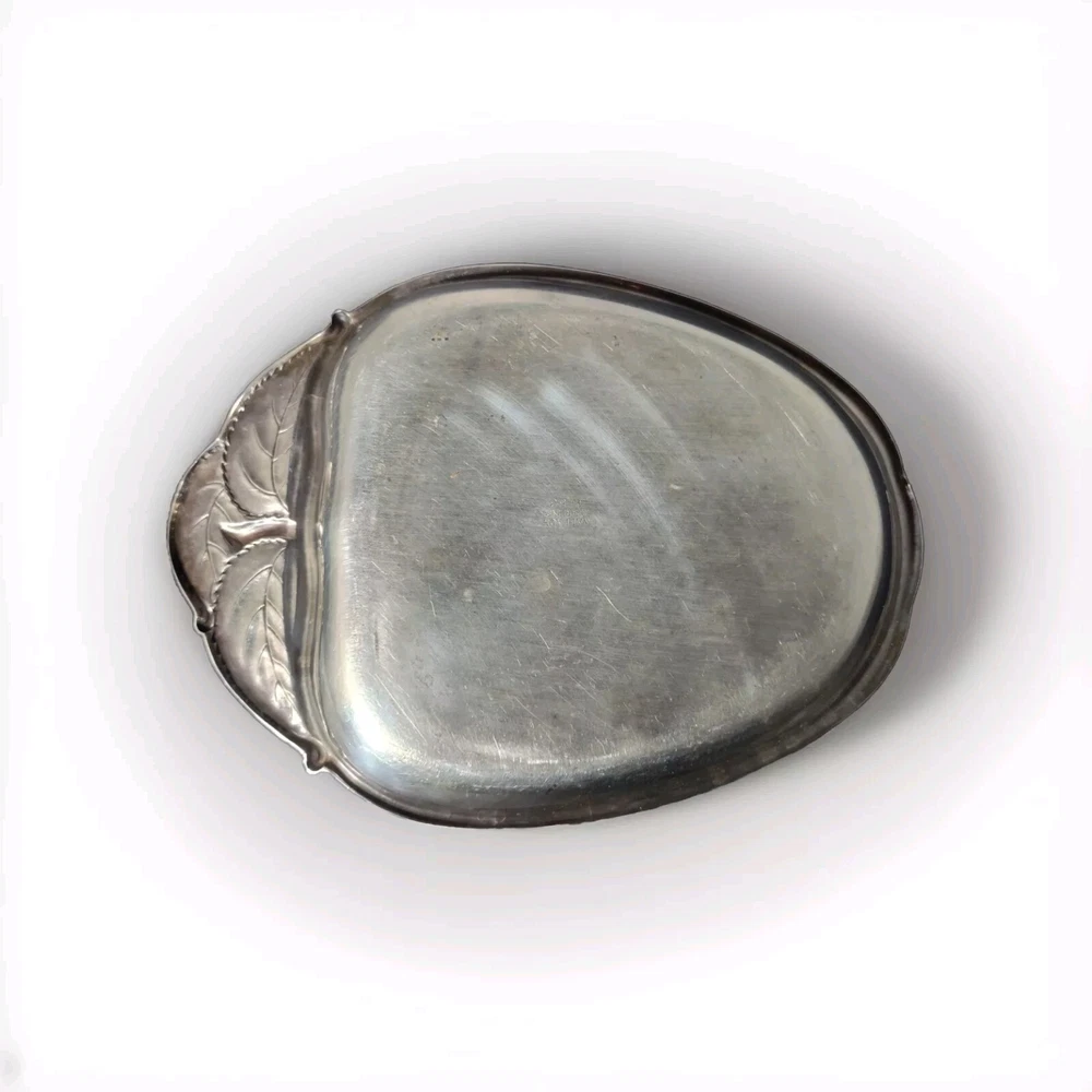 This Wallace sterling silver tray is in the shape of an apple with a stem and leaves, and is marked with the Wallace logo and the pattern number 4453. The tray is made of sterling silver, and is a unique and rare piece that would make a great addition to any collection. The intricate details of the apple design make this tray a beautiful and valuable item for any silver enthusiast.