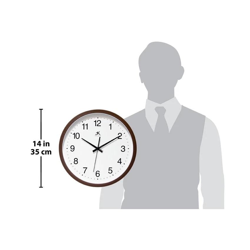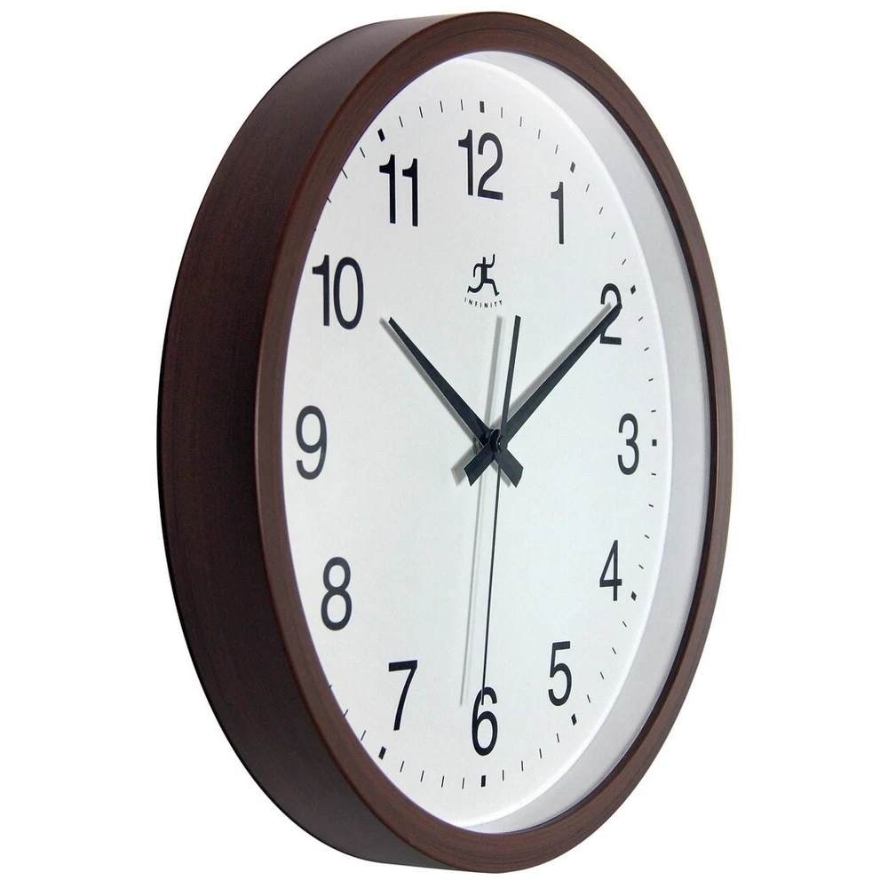 Featuring a simple classic design, the Walnut Finish wall clock is perfect for the office, dorm room or other space that needs a functional and basic time piece. This indoor wall clock features a walnut finish case, glass lens as well as a second hand. With its plain white face and black hands, this clock can easily be read anywhere it hangs. Additionally, the Walnut Finish wall clock features silent movement for peace & quiet. At 14", this indoor wall clock is the perfect size for offices, schools and dorm rooms. Features: 14 in Round Wall Clock for Indoor UseQuartz Movement for Accurate Time KeepingGlass Cover over a White Face & Black Metal HandsUses 1 AA Battery (Not Included)14 in H x 14 in L x 2 in DSilent Movement for Peace & Quiet Free Shipping Over $49.99* Details Walnut Finish Brown Simple 14 inch Wall Clock by Infinity Instruments - 14 x 2 x Product Description: Featuring a simple classic design, the Walnut Finish wall clock is perfect for the office, dorm room or other space that needs a functional and basic time piece. This indoor wall clock features a walnut finish case, glass lens as well as a second hand. With its plain white face and black hands, this clock can easily be read anywhere it hangs. Additionally, the Walnut Finish wall clock features silent movement for peace & quiet. At 14", this indoor wall clock is the perfect size for offices, schools and dorm rooms. Features: 14 in Round Wall Clock for Indoor Use Quartz Movement for Accurate Time Keeping Glass Cover over a White Face & Black Metal Hands Uses 1 AA Battery (Not Included) 14 in H x 14 in L x 2 in D Silent Movement for Peace & Quiet