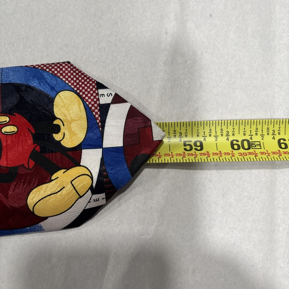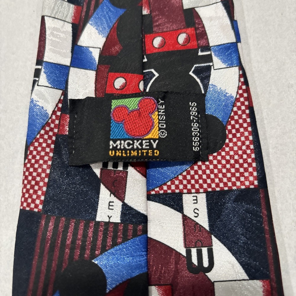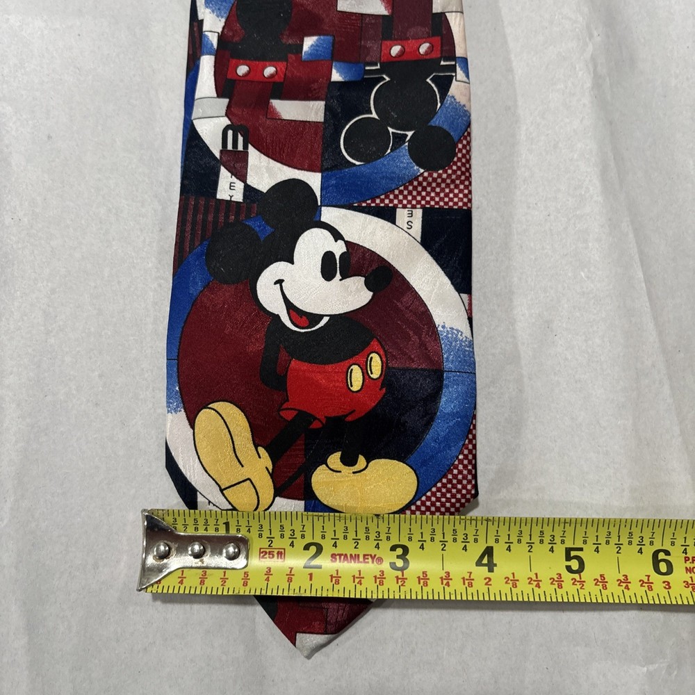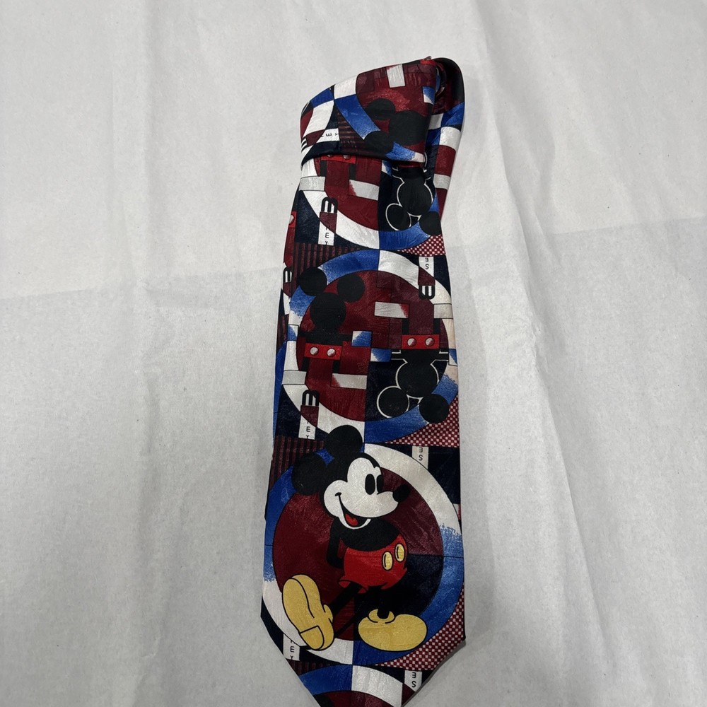 This Walt Disney necktie features a red and blue geometric pattern with Mickey Mouse images incorporated into the design. Made in Italy from polyester satin material, this classic length tie is a stylish accessory for men. The designer brand and Disney theme make it a unique and eye-catching piece for those who are fans of the iconic Mickey Mouse character. Perfect for adding a touch of Disney magic to any formal or casual outfit.