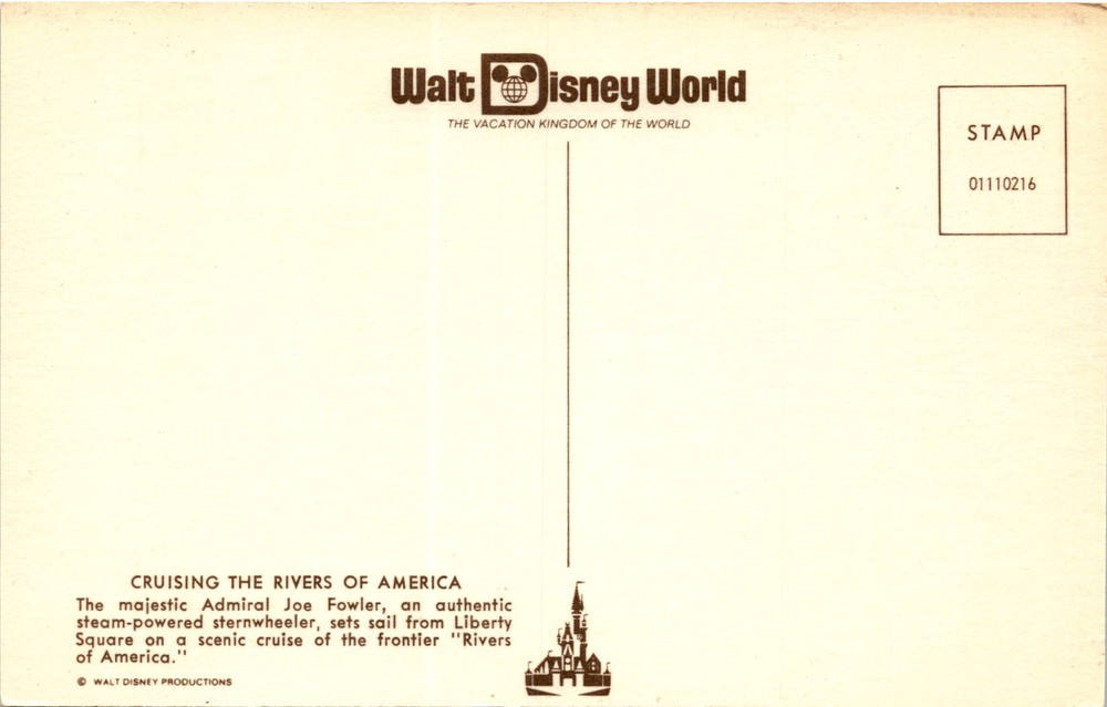 MAKE AN OFFER. THE MORE YOU BUY THE BETTER DEAL I WILL ACCEPT The postcard features an image of Walt Disney World, known as The Vacation Kingdom of the World. It showcases the steam-powered sternwheeler named Admiral Joe Fowler cruising the Rivers of America at Liberty Square. The postcard is a product of Walt Disney Productions.Walt Disney World is a world-renowned entertainment complex located in Orlando, Florida.