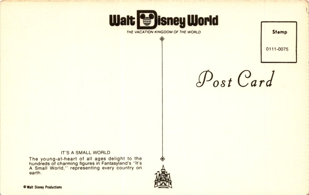 MAKE AN OFFER. THE MORE YOU BUY THE BETTER DEAL I WILL ACCEPT The postcard is promoting Walt Disney World, known as The Vacation Kingdom of the World. It features an image of It's a Small World, a popular attraction in Fantasyland. This ride showcases hundreds of charming figures representing different countries around the world. Walt Disney Productions is credited on the postcard.