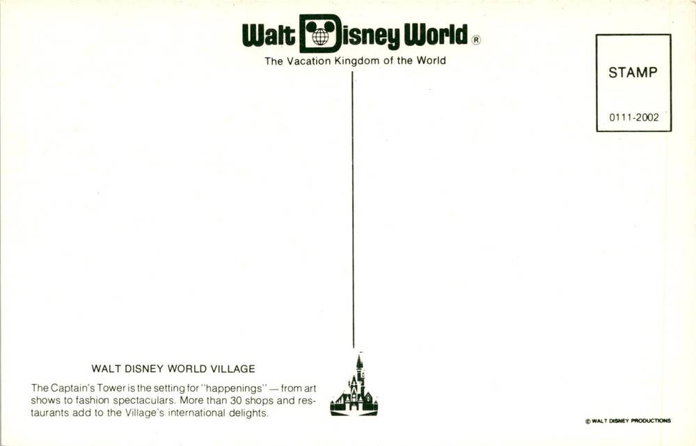 MAKE AN OFFER. THE MORE YOU BUY THE BETTER DEAL I WILL ACCEPT This postcard is promoting Walt Disney World, known as the Vacation Kingdom of the World. It highlights the Walt Disney World Village, specifically mentioning the Captain's Tower as a venue for various events like art shows and fashion spectacles. The village boasts over 30 shops and restaurants offering international delights.