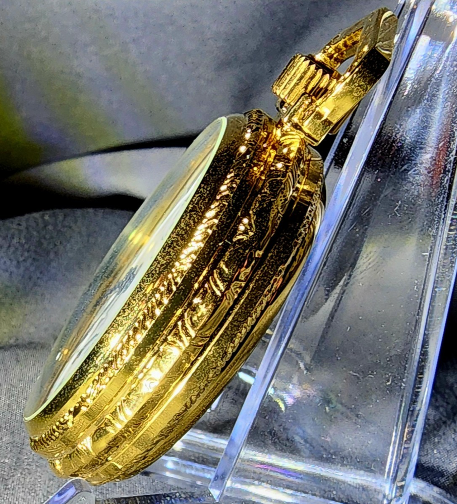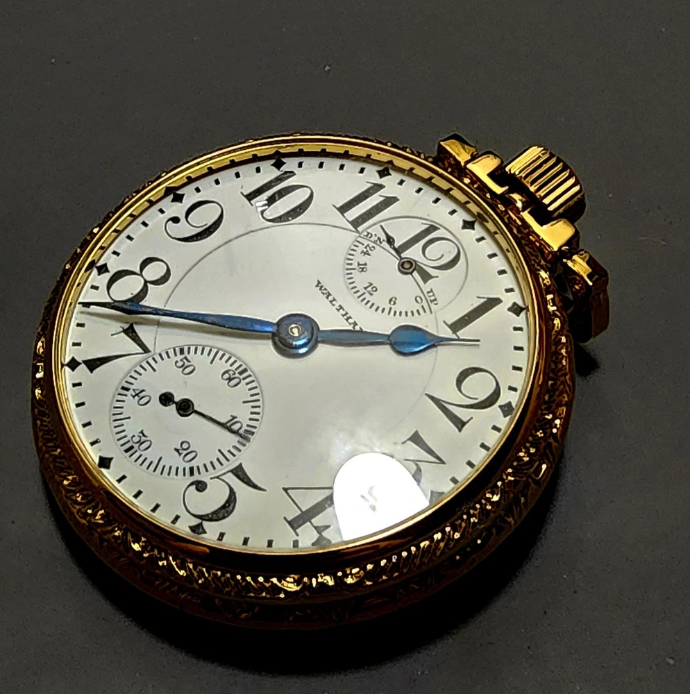 MERRY CHRISTMAS! , LOOKING FOR A GREAT PRESENT? YOU JUST FOUND IT! ONLY 400 OF THESE GOLD PLATED CASES WERE PRODUCED, DIFFICULT TO FIND. IN MY OPINION THIS CASE IS AN UPGRADE TO THIS BEAUTIFUL WATCH THE CASE IS ABSOLUTELY GORGEOUS AND PROFESSIONALLY ENGINEERED. I WAS LUCKY TO GET MY HANDS ON ONE SOME 4.5 YEARS AGO. IN THE CORRECT SUNLIGHT THE WATCH HANDS ARE BLUE IN COLOR, OTHERWISE THEY LOOK BLACK. THIS BEAUTIFUL POCKET WATCH IS STUNNING. 1915 Waltham Crescent. Up Down Indicator 16S 21 Jewels Pocket Watch is running, lever set and winds correctly, AND KEEPING GREAT TIME! Please see "pocket watch data base report" in display pics. Condition is Pre-owned. Shipped with UPS Ground . "RAIL ROAD GRADE" THIS WATCH HAS A CRYSTAL BACK COVER, ITS A SHOW CASE FOR STORE DISPLAY. WATCH ORIGINALY CAME WITH VARIOUS TYPE CASES PER " P0CKET WATCH DATA BASE" CASE AND CRYSTALS ARE IN BEAUTIFUL SHAPE, DIAL IS EXCELLENT.AND CLEAR. WATCH KEEPS GOOD TIME, CHECKED AGAINST OTHER QUARTZ WATCHES,IT WAS RIGHT ON. THE WATCH WINDS SMOOTH WITH ZERO HARD SPOTS VERY EASY TO WIND, SETS THE SAME WAY. I DO NOT HAVE PROFESSIONAL TIMING EQUIPMENT SO I CAN'T GO THAT FAR WITH GIVING YOU ACCURATE TIMING INFORMATION. All watches are sold as is and no returns I do not guarantee the functionality of anything, I am not a watchmaker and I do not fix watches I just sell them. if I say they're in new condition, that's because they are with no guarantees of functionality whatsoever at the time of delivery, just the fact that shipping is used can give rise to all kinds of unrelated damage problems. shipping is hard on watches Thank you for your understanding.