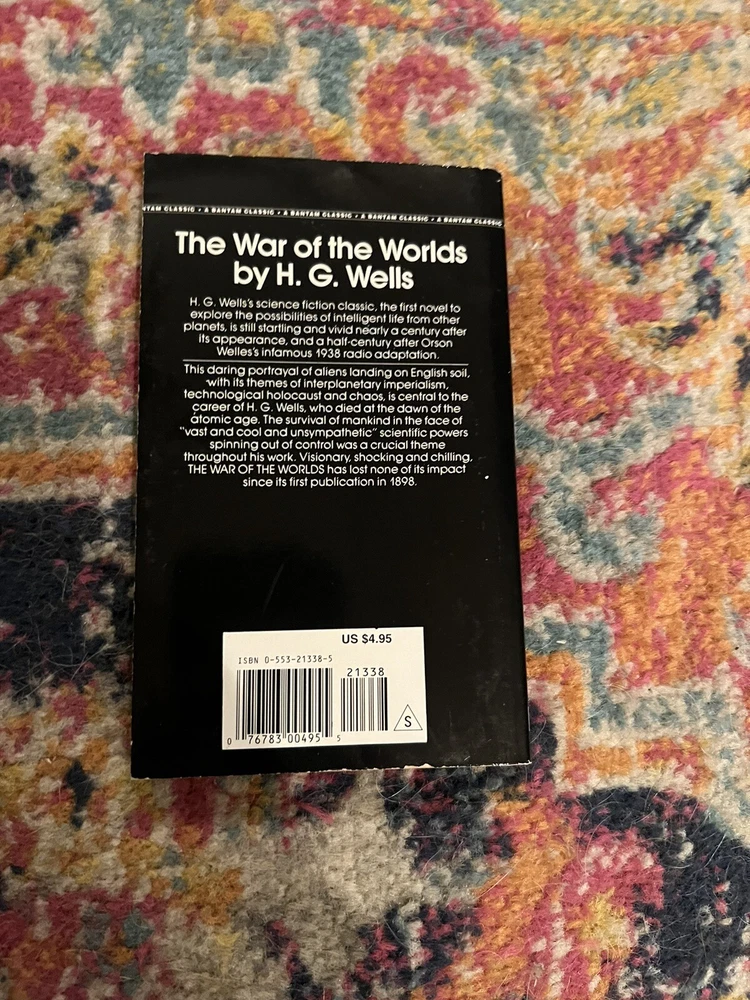 Immerse yourself in the captivating world of War of the Worlds, a classic science fiction novel by H.G. Wells. This Bantam Classic Edition, published in 1988, is a must-have for any book lover's collection. With 208 pages of thrilling action and adventure, this mass market format book is perfect for on-the-go reading. Discover the shocking story of an alien invasion and the heroic efforts of a young man to save the world. This reprint edition features all the original details and is in great shape. It's a perfect addition to any category, whether you're a fan of classics, science fiction, or just a great literary piece. Get your hands on this amazing book today!