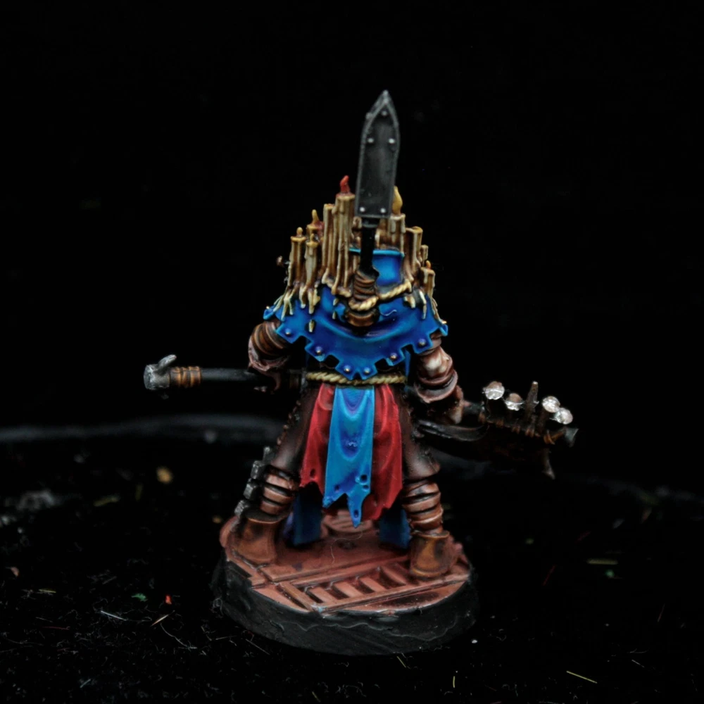 This is a fully assembled and painted 28mm Necromunda Hired Guns Cawdor Executioner miniature from Games Workshop's Warhammer 40K universe. The figure is painted in the Armageddon Steel Legion colors and is designed for use in the Necromunda specialist game. It was manufactured in Ukraine and is a collectible piece for fans of Warhammer and miniatures war games.