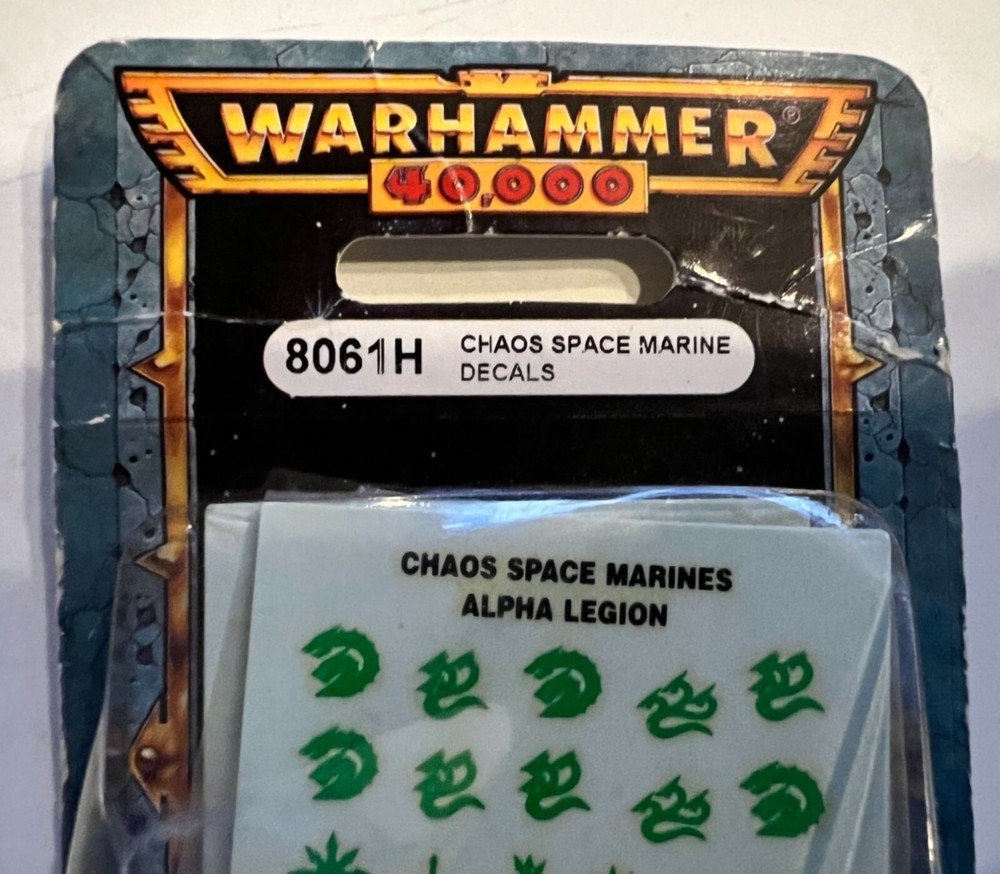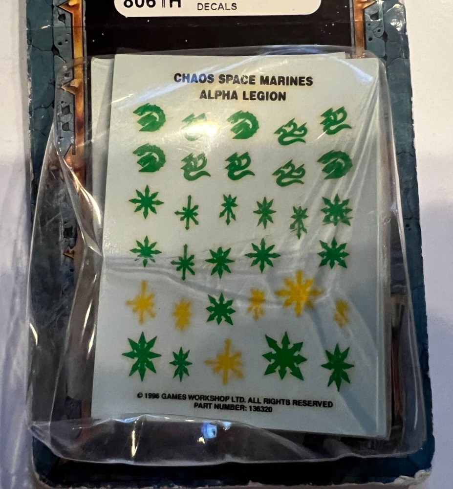 Enhance your Warhammer 40000 miniatures with these vibrant Chaos Space Marine decals. Designed for the Alpha Legion, they add character and detail to your collection. • Alpha Legion themed decals • Vibrant green and yellow designs • Official Games Workshop product • Part number: 136230 • Made in USA, ©1997 Pack is sealed, intact. Outer package is worn with frayed edges and heavy creasing. Free shipping. Professional packaging always, since 2003.
