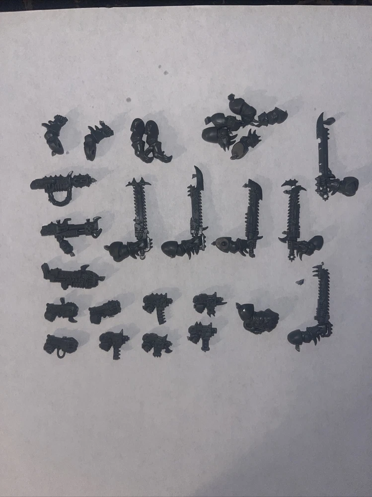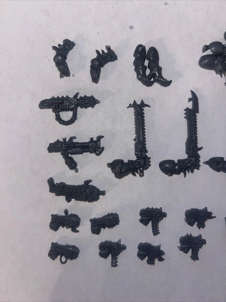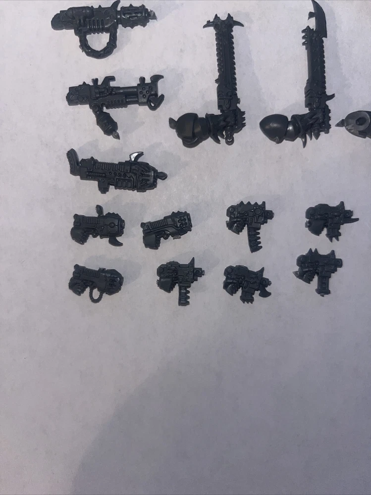 Warhammer 40k Chaor Raptor Weapon Lot, Chainsword, Power Fist, Melta Gun, Plasma. Includes the following 5x bolt pistols 3x plasma pistol 1x plasma gun 1x melta gun 1x power sword 1x power fist 5x chainswords 1x flamer Arms
