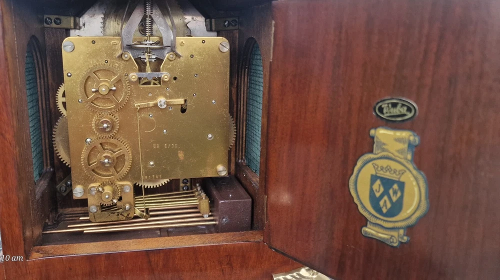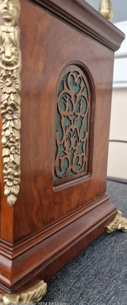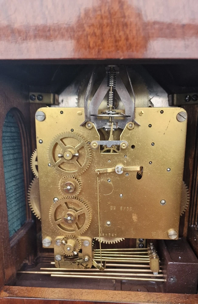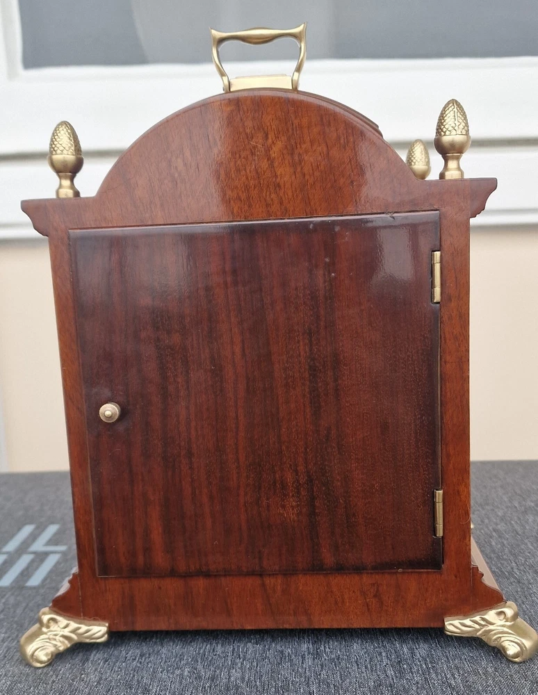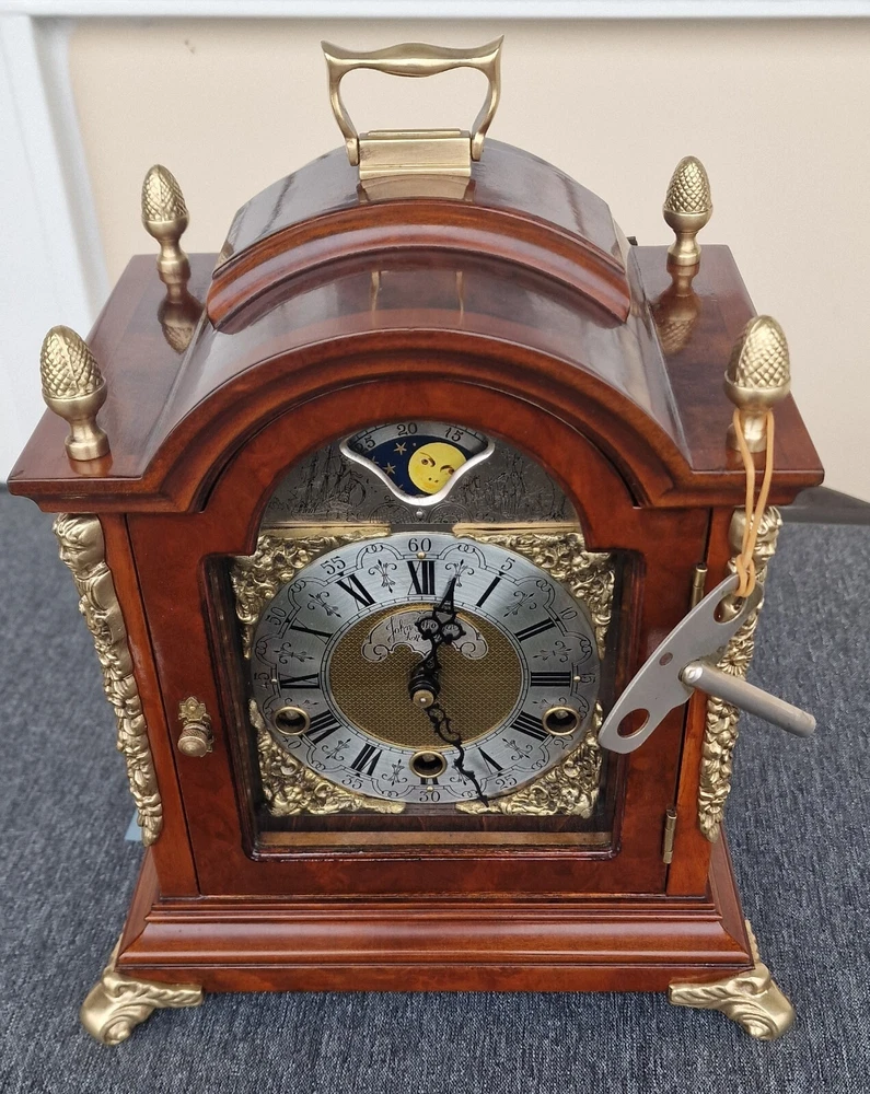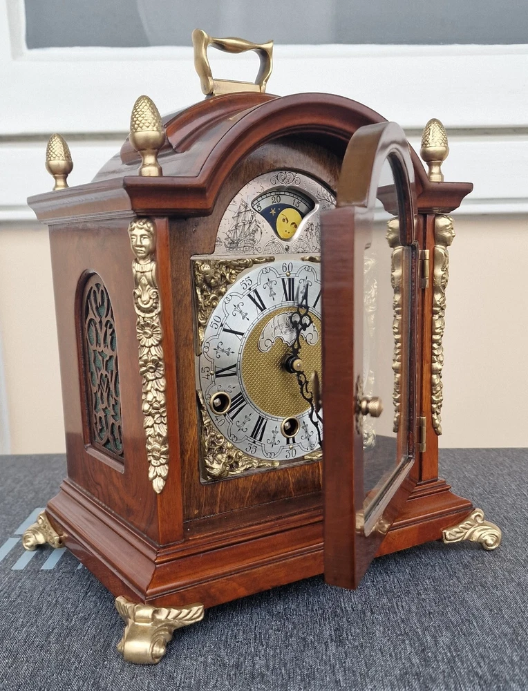 Vintage Westminster Dutch Warmink Shelf Clock. This clock is fully working and in beautiful vintage condition. This clock chimes it's Westminster tune perfectly every quarter of the hour via 5 hammers hitting 5 rods. Beautiful dial with fully working rotating rolling moon phase, that turns over a 19.5 day period. John Thomas London named on the front dial. See it via the YouTube link below by copying and pasting the link below to your browser. https://youtu.be/PwM-ZZiQ_K8 Gloss finished wood case . Brass decoration to feet and handle and side columns. Fretwork side panels to each side that enhance the sound of the Chimes. The clock will run for 8 days on a full key wind. Original factory sticker inside the rear door. Complete with key. The Warmink factory in The Netherlands is none existing anymore. 28cm - high with handle raised. 23.5cm - across brass feet. 17.5cm - depth across the brass feet. This clock is a used second hand vintage item and in used condition. It is not a new product. Please view all pictures.. Postage : We post UPS to the USA. UK = 49.99 usd USA = 79.99 usd Canada = 89.99 usd Worldwide 99.99 usd Please be aware you may be charged VAT / Import tax on the final price of your item on arrival. These additional costs are not included in the final price or shipping. These charges may be collected by eBay, or the carriers, or when you collect from a pick up location. These charges are set by your own country. Many of the items that we sell are classed as Vintage or Antique and therefore are not brand new out of a box, and may have minor nicks, dings, scuffs, scratches, wear due to being used over the many years. All of our listings we try to be as complete as possible with the description of the products we sell and offer additional pictures and movie footage. The listing is completed as expected with any defects listed however this does not imply that the lot is in perfect (new in a box) condition or completely free from wear and tear from imperfections. If you require more details on this product or have any specific questions please email me before you bid and I will only be to happy to answer your questions within 24 hours. Antique clocks after transport no matter how well they have been looked after or serviced may require setting up, adjustments and setting into beat when you receive them and i always recommend a professional or an experienced clock person to do this correctly for you. Unfortunately with some clocks it is not a matter of unpacking them, putting the pendulum on and away they go, some clocks will need the extra adjustments and setting into beat so please remember this before bidding. Most clocks will be ok and will not need any additional adjustments but please bear in mind this may not be the case. Any clocks returned because of setting up issues or adjustments needed after transit then a fee will be applicable. For your piece of mind we test all our clocks here before they are sent out and any issues are either sorted or described in the add, the clock will not have any problems as they are tested vigorously before sending. We do not offer any guarantee on time keeping after the clock has been sent via the postal system. We are not clockmakers, we do not repair clocks. We do not service the clocks ourselves, we also have no service history, however if we obtain a clock that is not running then it is repaired and service by our local clock maker.. We ensure they are all running for a period of 7 days before they are listed. We do not guarantee the time keeping of your clock simply due to it being posted out and subjected to harsh treatment which may effect the running. Also all parts are non guaranteed as they are original and we cannot tell is any are worn for inside. We also have no history or any services in the past so we do advise a service and clean as you would a second-hand car. We will offer advice with regards to set up and adjustment if required by mail or we will call you. A service will ensure the smooth running of your clock for many years to come and is inexpensive.. Additional return policy details: A note about shipping. I take great care and attention to my packing and shipping. Photo's will be requested by the buyer on all damaged goods so that a claim can be made. Clocks and Barometers may require adjustment since the constant vibration and jarring of shipment often causes them to go out of beat, or a pin or lever may loosen during shipment and may need a service by a clockmaker should this be the case then a solution can be agreed on each party.