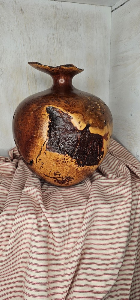 Warren Vienneau Manzanita Burl Wood Vase 11 inch tall 10 inch round signed by artist on bottom One of a kind has very cool voids cracks and holes all occurring naturally from the growth of the tree! The top is unusual as it's not symmetrically turned it's a natural shape oblong with a 3/4 inch approximately hole in center!