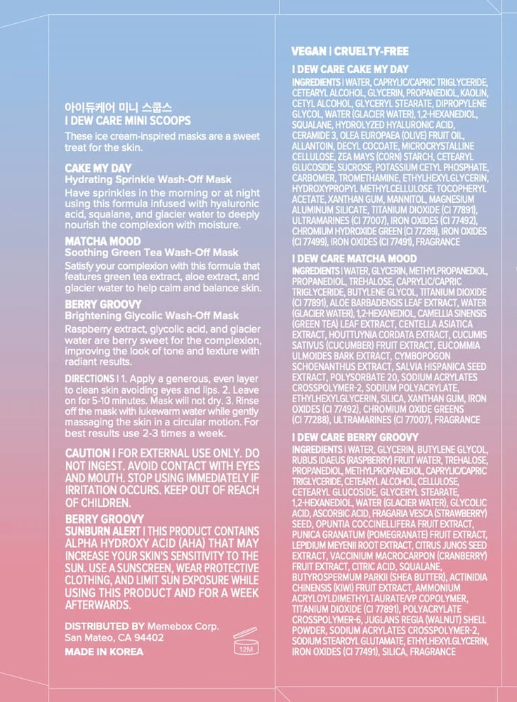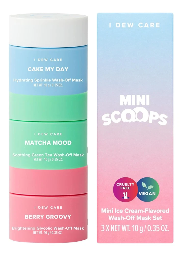 WHO IS I DEW CARE: Seriously Fun Skincare. We make fun formulas that seriously work. Smile-inducing K-beauty for her, him, they, and everyone. TRIPLE THE FLAVOR: Can’t decide on just one? Try them all with this trio of our yummy ice cream-inspired wash-off masks! Includes Cake My Day, Berry Groovy, and Matcha Mood, all in 10g (0.35 oz.) tubs. CAKE MY DAY: This sprinkle wash-off mask has hydrating rainbow sprinkles, hyaluronic acid & a birthday cake scent (that smells yummy enough to eat) all wrapped up in a soft-serve textured mask, making hydrated skin a piece of cake! MATCHA MUCH?: This green tea-scented wash-off mask is sorbet inspired and infused with matcha and soothing aloe help. FEELIN' GROOVY: This berry-scented wash-off mask contains exfoliating strawberry seeds. HERO INGREDIENT: Hyaluronic acid & squalane (Cake My Day) | Glycolic acid & raspberry extract (Berry Groovy) | Green tea extract & aloe extract (Matcha Mood). Product Description Hyaluronic Acid Included Hydrate, refresh, and nourish dry skin with a cake frosting scented smooth and creamy texture. Glycolic Acid Included Hydrate and exfoliate uneven skin texture with a strawberry scented pink creamy gelato texture. Green Tea Extract Included Soothe and restore sensitive and red-looking skin with a matcha scented soft sorbet texture. 1 Cake My Day 2 Berry Groovy 3 Matcha Mood 1 Stunning Results 2 Mix & Mask Indulge in a Spa Day with Mini Scoops Mask Trio The video showcases the product in use. The video guides you through product setup. The video compares multiple products. The video shows the product being unpacked. Does this set come with an applicator? Mini Scoops trial set does not come with an applicator, but the full sized products do! How much use can you get from one mini tub? Everyone uses different amounts of the mask per usage, but we estimate that you can get between 1-2 uses out of each mask in the trio! What is the size of the product? Each tub comes with 0.35 oz. of product. Can I use the masks together at one go? Sure. We recommend applying different flavors on different parts of the face at the same time to target different skin needs that you may have. I Dew Care More About My Skin! Add to Cart Add to Cart Add to Cart Add to Cart Customer Reviews 4.5 out of 5 stars 6,653 4.5 out of 5 stars 6,653 4.5 out of 5 stars 6,653 4.5 out of 5 stars 6,653 4.5 out of 5 stars 6,653 4.5 out of 5 stars 6,653 4.5 out of 5 stars 6,653 Price $27.90 $ 27 . 90 $20.00 $ 20 . 00 — $23.00 $ 23 . 00 — — $9.99 $ 9 . 99 What It Is Wash-off Masks with Headband Bday Cake Wash-Off Face Mask Green Tea Wash-Off Face Mask Raspberry Wash-Off Face Mask Cocoa Wash-Off Face Mask Wash-off Masks with Headband Multi-functional Applicator Benefits Hydrating Hydrating Soothing Revitalizing Purifying Restoring complexion Reusable, hygienic Key Ingredients Hyaluronic acid, Glycolic acid Hyaluronic Acid, Squalane Green Tea & Aloe Extract Raspberry Extract Cocoa seed butter & powder Cocoa seed butter & powder - Vegan ✔ ✔ ✘ ✘ ✔ ✔ ✘ Cruelty-free ✔ ✔ ✘ ✘ ✔ ✔ ✘