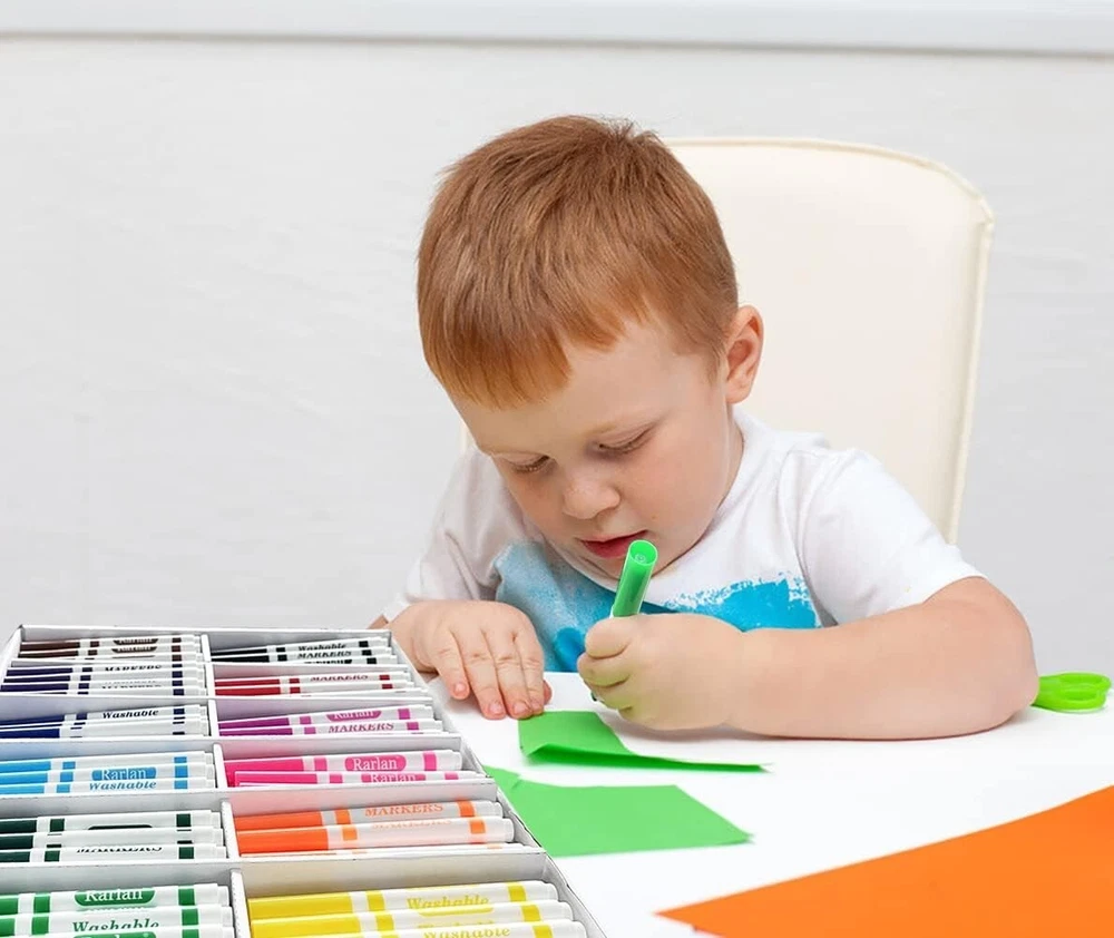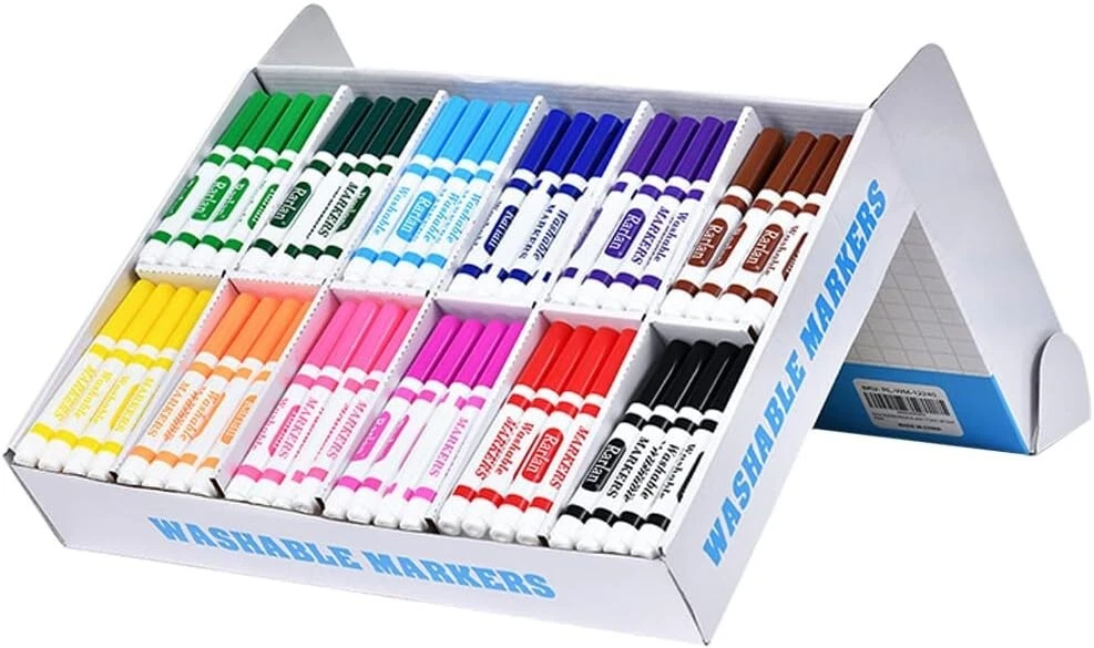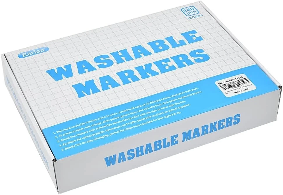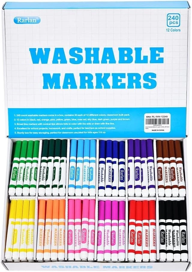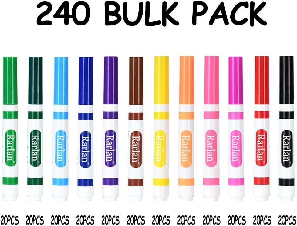 Washable Markers Bulk, Markers for Kids, Bulk pack, 12 Colors, 240 Count 240 count washable markers come in a box, contains 20 each of 12 different colors, classroom bulk pack. 12 colors in black, red, orange, pink, yellow, green, blue, rose red, sky blue, dark green, purple and brown. Broad line markers with conical tips allows kids to color with the side or draw with fine line. Excellent for school projects, homework, and crafts, perfect for teachers as school supplies. Sturdy box for easy storaging, perfect for classroom use, ideal for kids ages 3 & up. 240 count washable markers come in a box, contains 20 each of 12 different colors, classroom bulk pack.