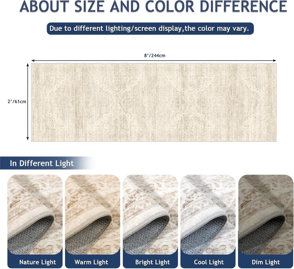 Washable Runner Rug 2x8 Runners for Hallways Vintage Kitchen Rugs with Non-Slip Non-Slip & Safe:Our area rugs feature an advanced non-slip backing that keeps it securely in place, even in high-traffic areas. The anti-slip design ensures safety for both kids and pets, preventing accidental slips and falls. Whether placed in the entryway, laundry room, or bathroom, this rug stays firmly put, offering you peace of mind and a secure footing for your family. Machine Washable & Easy Care:Say goodbye to complicated cleaning routines! This indoor entryway rug is fully machine washable, making it incredibly easy to maintain. Simply toss this washable area rug in the washing machine for a deep clean, and the washable rugs will come out looking as fresh as new, but be careful that this machine washable area rugs are sensitive to high-powered vacuums. No more worrying about spills or stains, let these runner rugs keep your space comfortable and stain-resistant. Kids and Pets Friendly:Designed with families in mind, our OEKO-TEX Certified carpets are the perfect addition to any home with children or pets. The hallway runner’s soft texture provides a safe place for play and relaxation, while the durable fabric ensures it can handle the wear and tear of active little ones and furry friends. Rest easy knowing this carpet floor runner is as tough as it is cozy. Soft and Unique Design:Featuring a 0.24" low pile height, this 2x8 washable rug provides a plush, gentle feel underfoot while maintaining a low profile that allows doors to open smoothly. Featuring intricate floral and geometric motifs, the 2x8 runner rug creates a vintage yet timeless appeal. Perfect for adding character and charm, this design brings a sophisticated focal point to living rooms, bedrooms, or dining rooms. Versatile Area Use and Durable:Designed for versatility, the area rugs for living rooms, bedrooms, kitchens, nurseries, hallways, or home offices, bringing warmth and comfort to any corner of your home. Crafted with durable materials, our runners for hallways can withstand everyday use from busy households. Available in multiple sizes and colors, you can easily find the perfect fit, the small area rug for small space, the long runner rugs for big open rooms, or other sizes and colors for the layered styling. TIPS for Creases:If your rug arrives with creases, don’t worry! Simply lay it flat in a warm area, or roll it in the opposite direction to gently smooth out the folds. You can also use a steam iron on a low setting to relax the fibers. With a little care, your rug will be wrinkle-free and ready to enhance your space in no time. Shipping We offer FREE shipping on all orders! We ship within Three business days of payment, usually sooner. We use a selection of shipping services such as UPS, FedEx, USPS etc. We only ship to the lower 48 states, no APO/FPO addresses or PO Boxes allowed. Local pickups and combined shipping options are not provided at this time. Return You can return a product for up to 30 days from the date you purchased it. Any product you return must be in the same condition you received it and in the original packaging. Please keep the receipt. Customer satisfaction is very important to us. If you have any problem with your order, please contact us and we will do our best to make you satisfied. Contact Us If you have any queries, please contact us via ebay. We usually respond within 24 hours on weekdays. Please visit our eBay store to check out other items for sale! Thank you for shopping at our store.
