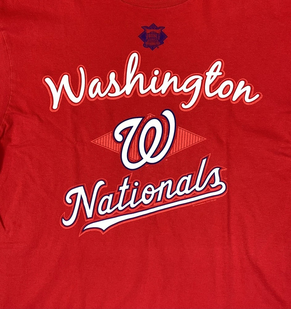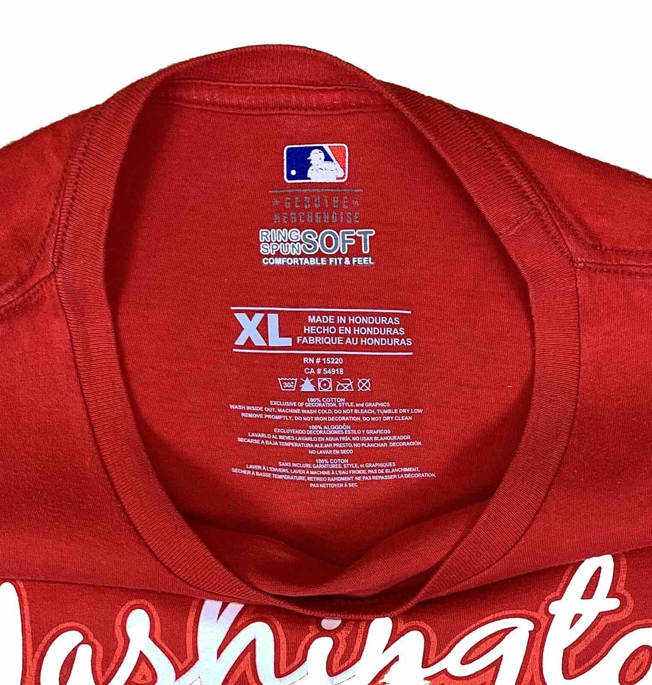 Washington Nationals MLB Baseball Logo Licensed T-shirt Size XL Red 100% Cotton Excellent Condition Measurements: Overall Length: 28” Shoulders: 20” Armpit to Armpit: 22.5” Sleeve Length: 8.5” Our Pre-Owned T-shirts are Inspected for Flaws, then Steam Cleaned & Folded. Most of our Pre-Owned Shirts are VG to Like New. Shipped USPS First Class. We ship fast!