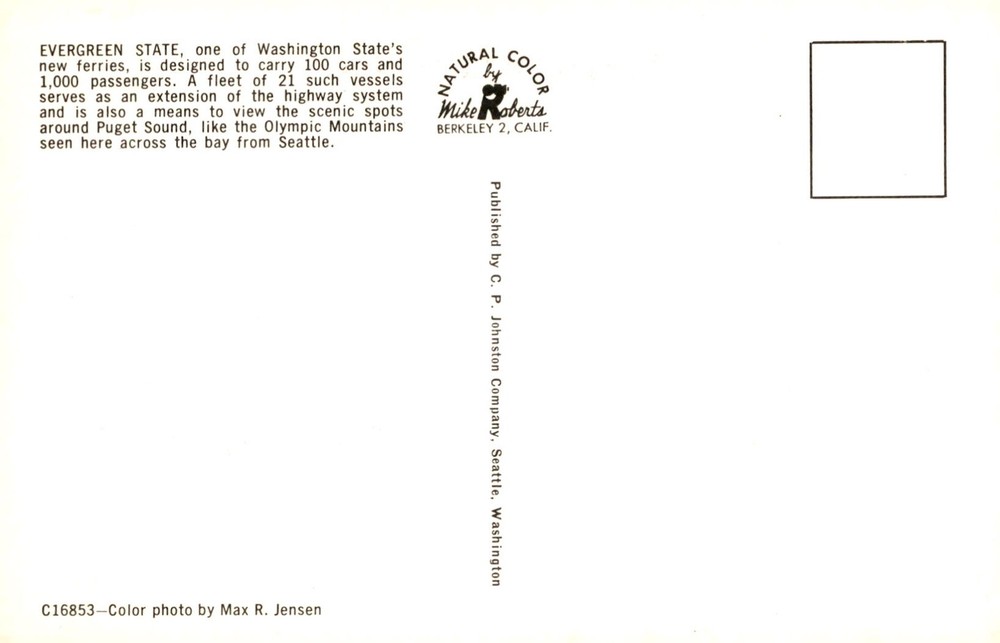 MAKE AN OFFER. THE MORE YOU BUY THE BETTER DEAL I WILL ACCEPT The Evergreen State ferry, capable of carrying 100 cars and 1,000 passengers, connects Washington's highways and offers scenic views of Puget Sound and the Olympic Mountains from Seattle.