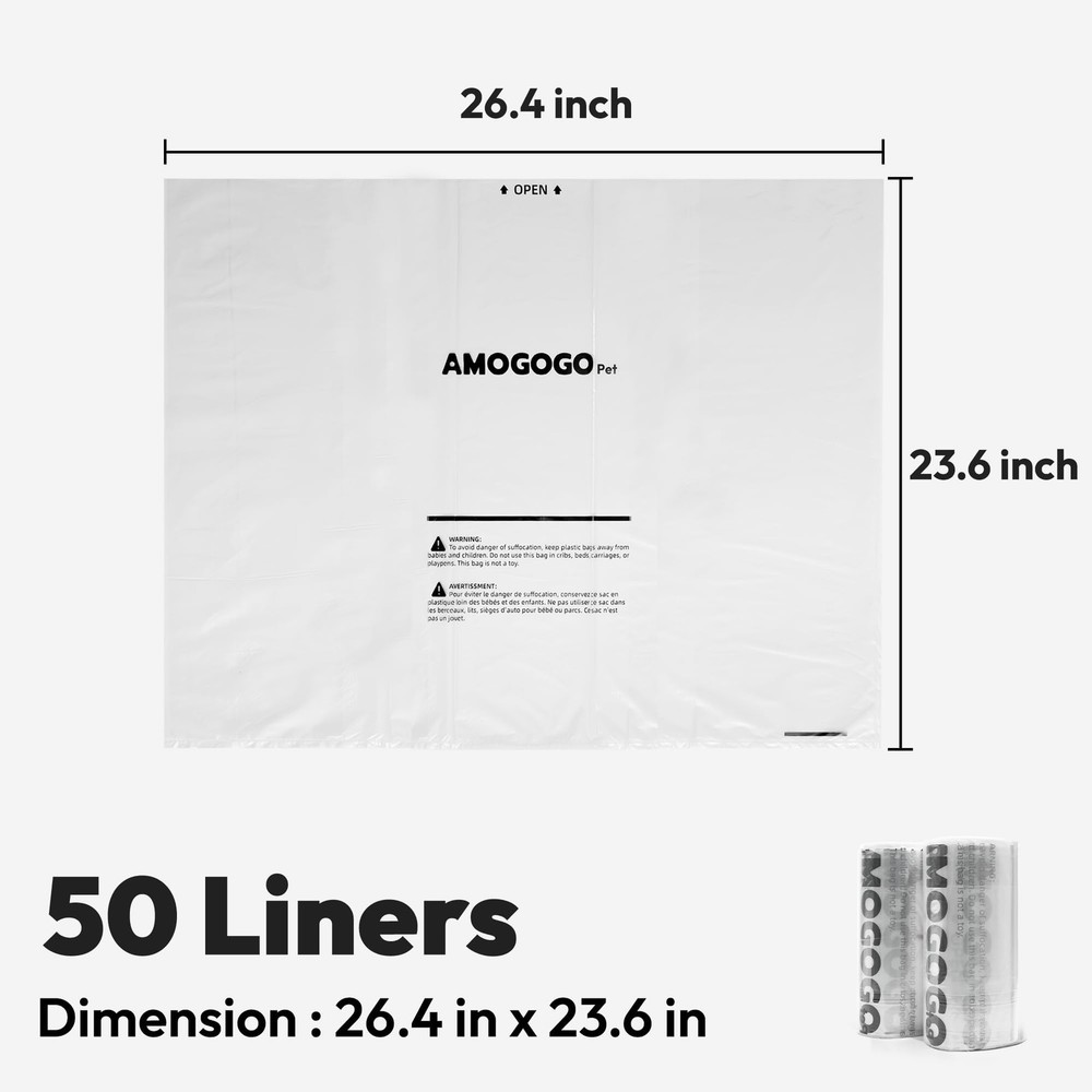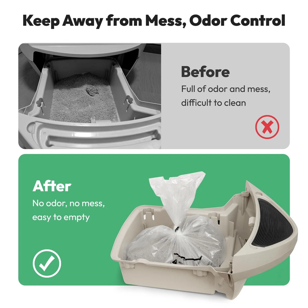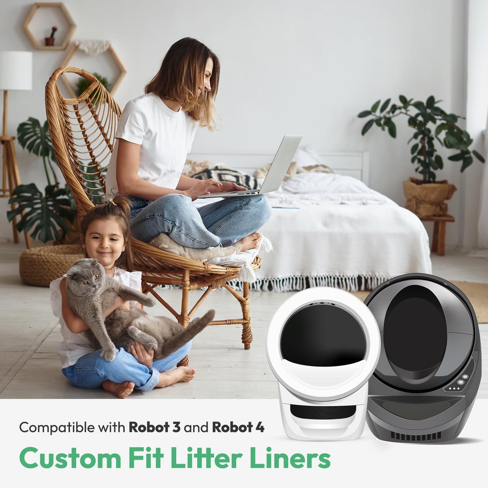Waste bags compatible with Robot 4 & 3 feature transparent design for precise waste level readings and monitoring your cat's health. Included are 50 unscented, ultra-strong liners, sized for 9 to 11-gallon bins, holding up to 22 lbs each. Crafted from premium material, they offer leak-proof, tear-resistant, and waterproof performance for effortless maintenance. Pre-separated and easy to install, these liners promise long-lasting cleanliness. Should any issues arise, our reliable customer support guarantees a prompt resolution within 24 hours. [Perfectly Compatible with Robot 4 & 3] Specially designed for self-cleaning cat litter boxes, these transparent waste bags ensure accurate waste level readings, avoiding any sensor errors. In addition, transparent waste bags also help you assess your cat's health by observing the cat litter. Compatible with Robot 4 and 3, check your model before ordering to ensure a perfect fit [50 Sturdy Liners Included] Comes with 50 unscented, transparent, ultra-strong litter box bags that fit 9 to 11 gallons (26.4 x 23.6 inches / 67 x 60 cm) and hold up to 22 lbs, providing long-lasting cleanliness and convenience [Leak-Proof & Tear-Resistant] Made from premium material with a robust seal, these liners are tear-resistant, scratch-proof, and waterproof, ensuring no leaks or odors. Keep your litter box cleaner and make changing liners effortless [Pre-separated Bags and Easy Installation] Every litter bag comes pre-separated, so no tearing apart is needed. Packed in rolls, they're easy to , saving space. For Litter Box 4, simply fold the liner edges over the waste drawer rim. For Litter Box 3, tuck the rolled edges into the four tabs in the drawer for a snug fit [Reliable Customer Support] If you encounter any issues with our litter box bags, please reach out us anytime for a prompt and satisfactory resolution within 24 hours [Note] This package only includes litter bags, not a automatic cat litter box. The litter box shown in the images is for illustration purposes only to demonstrate the compatibility with the bags. Please confirm the product details before placing your order