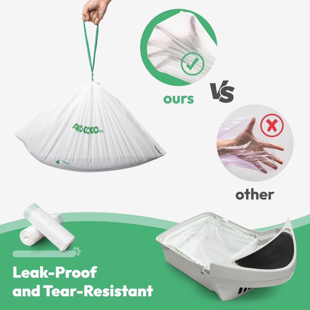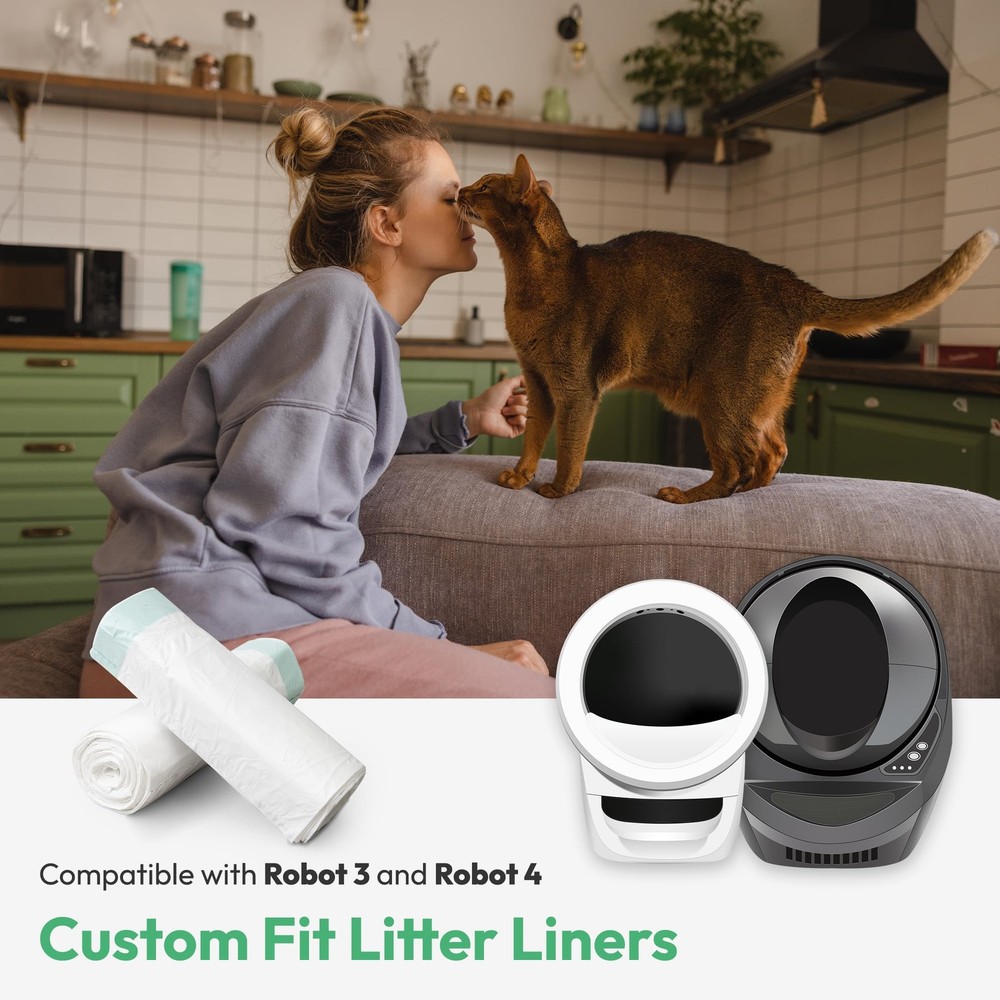 Compatible with Robot Model 4 & 3 self-cleaning litter boxes (confirm model before purchase). Each 26.4"x15.8" (67x40cm) bag supports up to 22 lbs, fitting 9-11-gallon drawers. This 50-pack of unscented, heavy-duty liners features leak-proof reinforced seals and tear-resistant materials to contain odors and withstand daily use. Pre-separated rolls ensure easy, space-saving storage and frustration-free setup: fold edges over Robot 4 drawers or tuck rolled edges into Robot 3’s tabs. The thick drawstring closure enables quick, knot-free disposal—simply pull to seal waste securely. Crafted for effortless maintenance, these waterproof bags keep your litter system hygienic while simplifying cleanup. Note: Litter box not included; images shown for compatibility reference only. Confirm product details to ensure proper fit. Compatible with Robot 4 and 3: Specifically designed to seamlessly compatible with Robot 4 and 3, these waste bags ensure a seamless match. Upgraded drawstring design for easy disposal Large Sturdy Thick Litter Liners: Each liner can hold 9 to 11 gallons, measuring 26.4 x 15.8 inches, with a maximum load capacity of 22 lbs. With durability, leak-proof, tear-resistant, and corrosion-resistant properties, they are ideal for use as waste bags in self-cleaning cat litter boxes Pre-separated & Rolls: Every waste bag comes pre-separated, so no tearing apart is needed, making cleanup a breeze. Packed in rolls, they're easy to store, saving space. Ideal for any home, these litter bags combine simplicity and efficiency in one tidy package Generous Quantity: Each package contains 50 unscented litter box liner bags, providing a six-month supply for your automatic cat litter box. No more frequent purchases needed Opaque Waste Bags with Drawstring: Our bags feature a sturdy built-in drawstring to prevent waste exposure and odor leakage. Swiftly tighten the drawstring to remove the litter bag, keeping your hands clean throughout the process. The opaque white design hides waste from view during disposal, making cleaning more pleasant Customer Service: Any defective litter box bag, please message us without hesitation, and we will offer you a suitable solution in 24 hours Note: This package only includes litter bags, not a automatic cat litter box. The litter box shown in the images is for illustration purposes only to demonstrate the compatibility with the bags. Please confirm the product details before placing your order