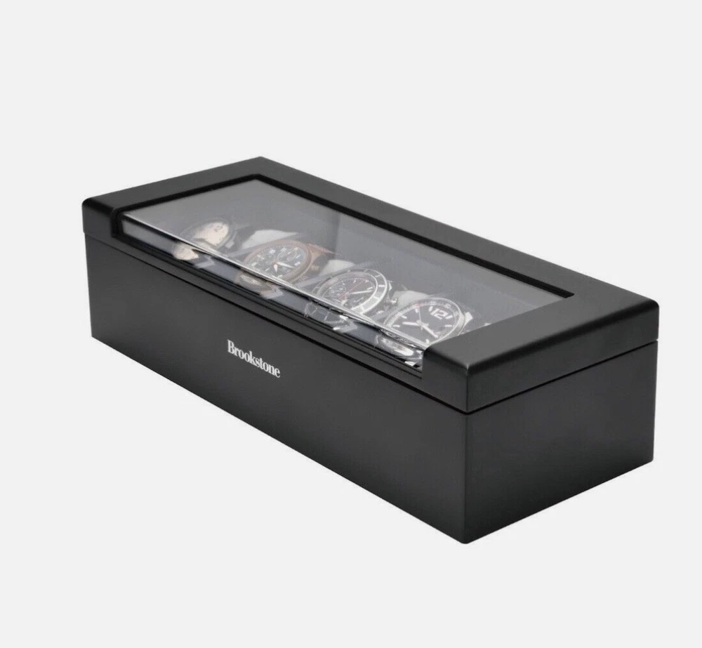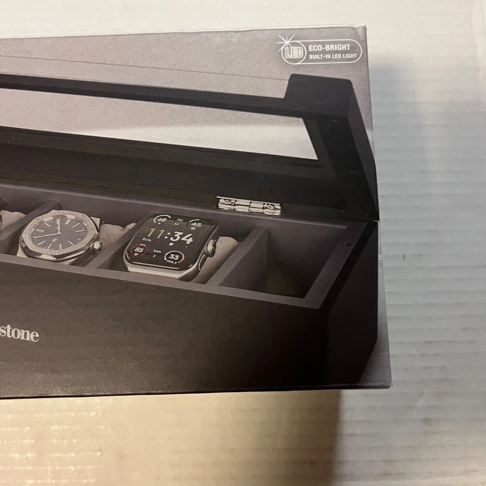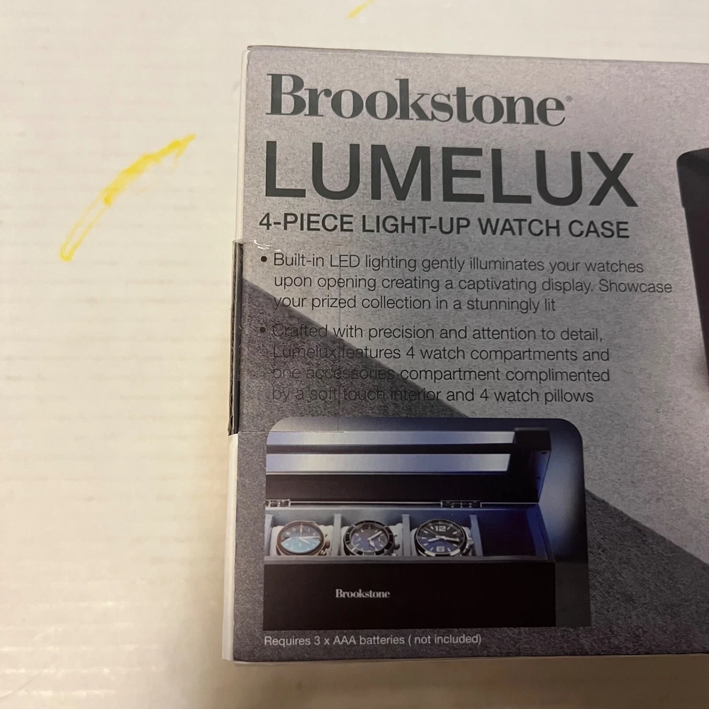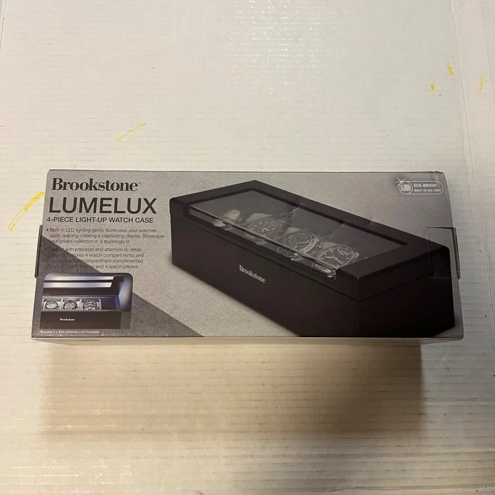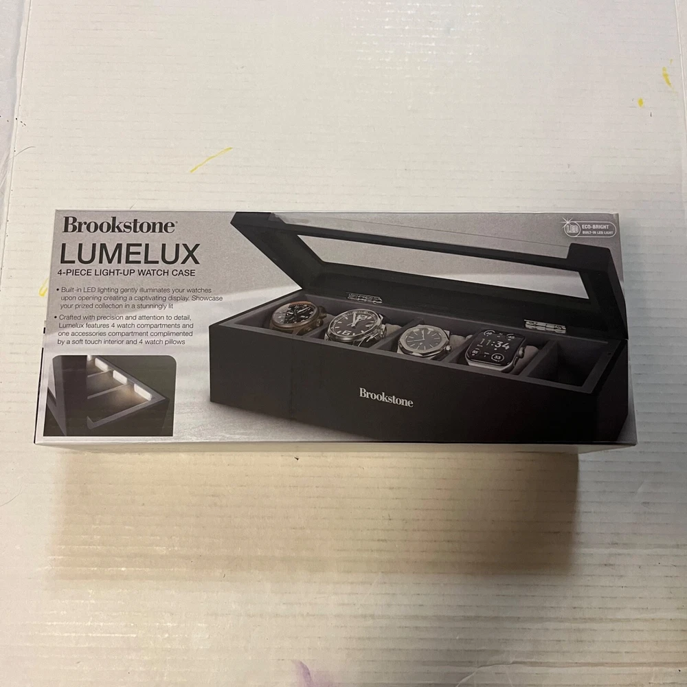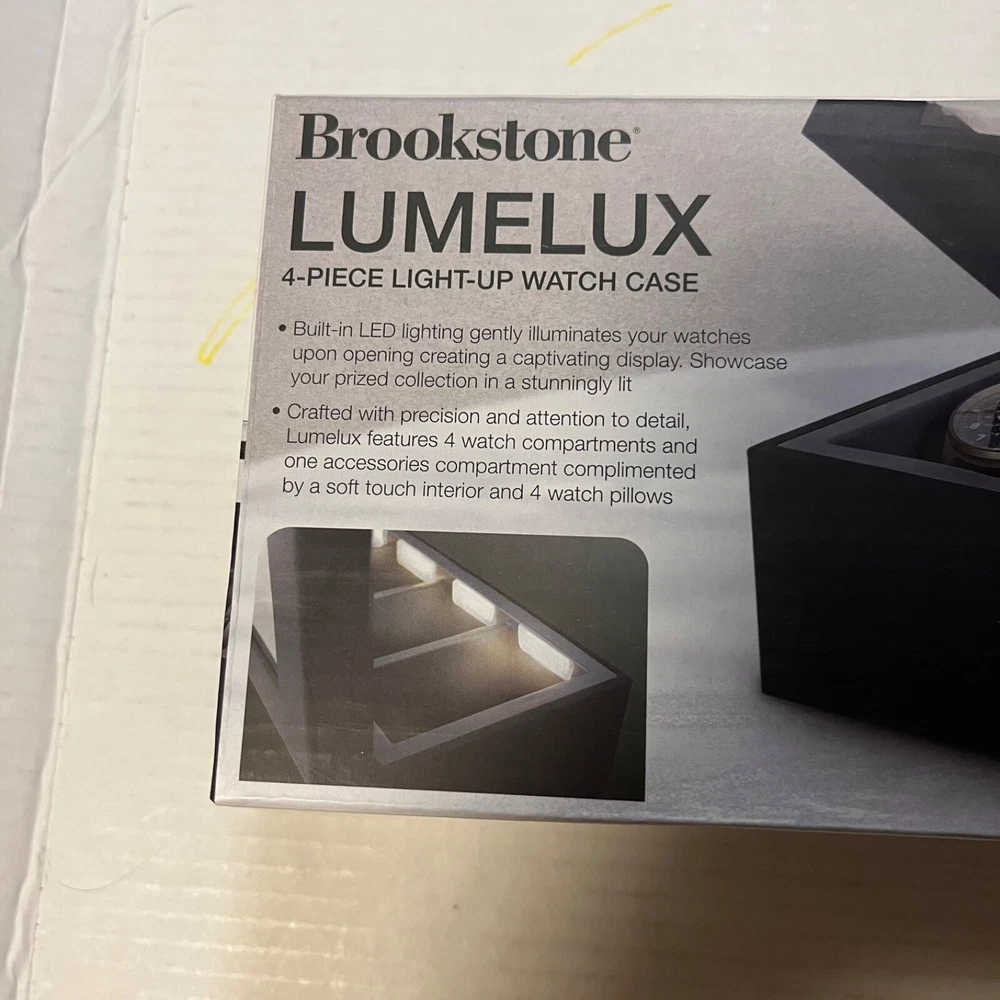Watch Box - Brookstone Lumelux Light Box 4-Piece Light-Up Watch Case NIB New A great gift for any watch collector in your life. Valentine’s Day. Father’s Day. Birthday. Built in LED lighting, gently illuminates your watches upon opening displaying them in all their glory. Brookstone is known for its great craftsmanship and this is no different. Four watch compartments, and one accessories compartment are complimented by a soft, touch interior and four watch pillows. Photos are part of description Ask with questions Bin BY