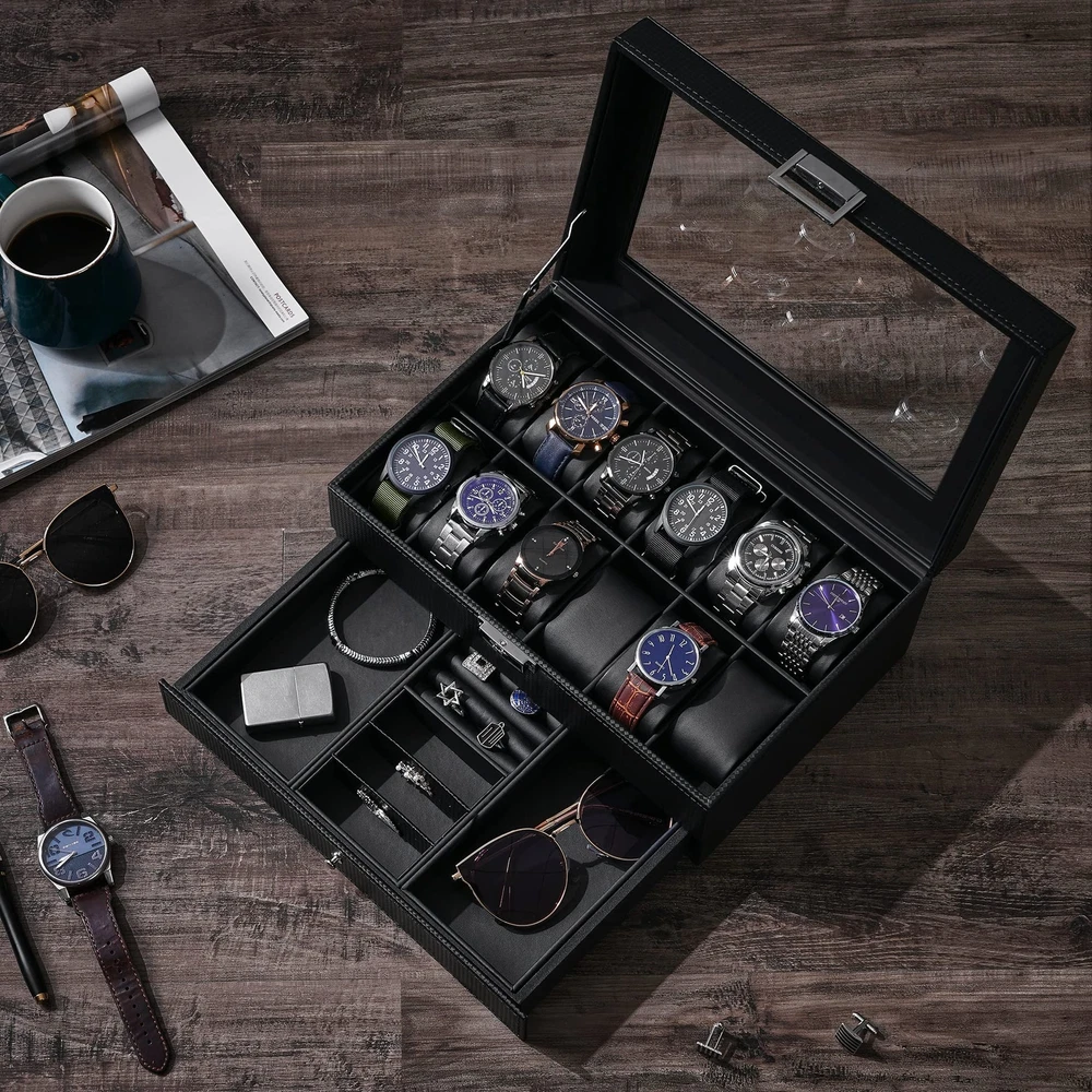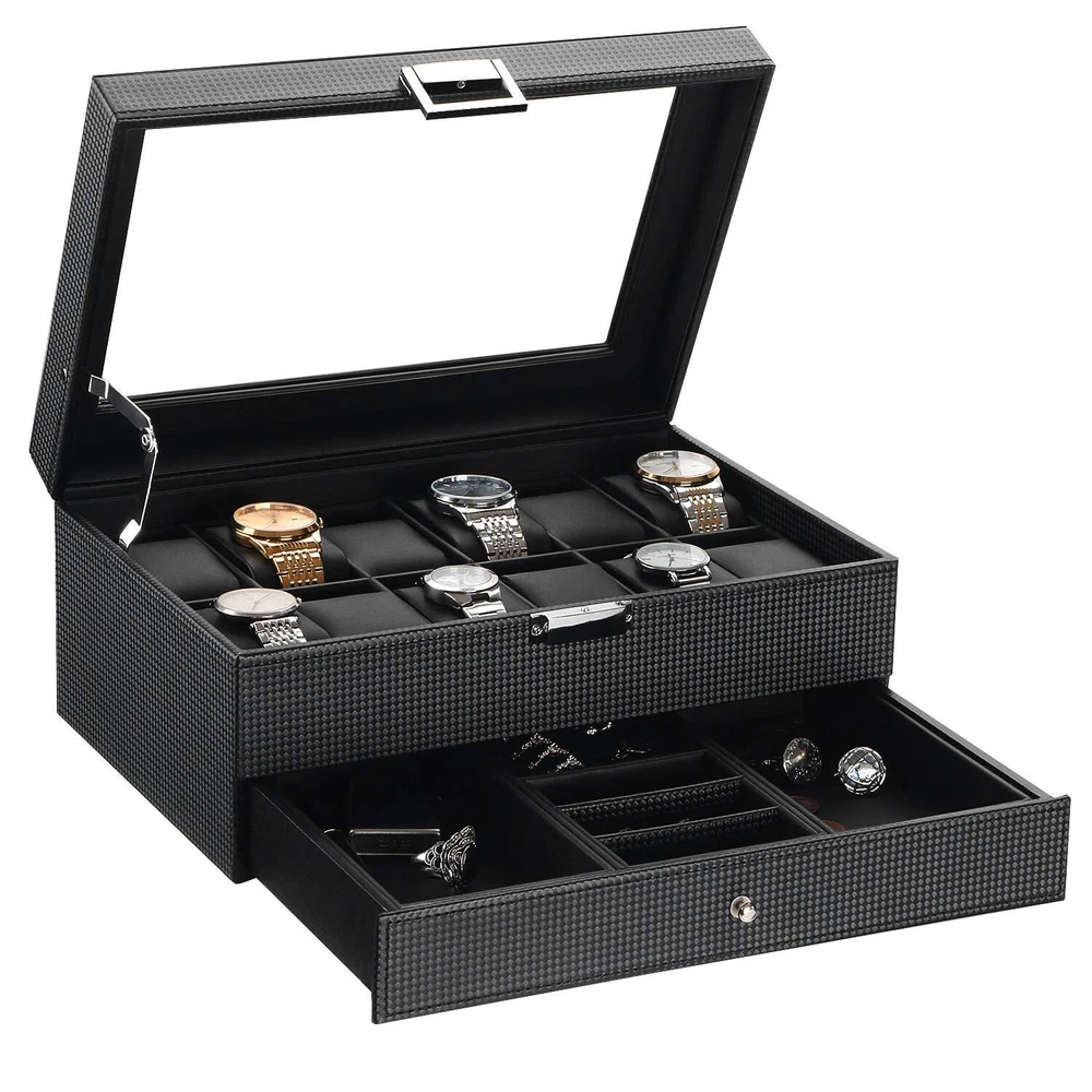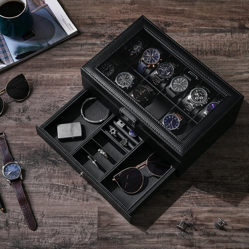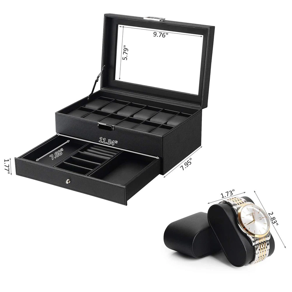 TOP-NOTCH QUALITY & CLASSY LOOK: Made from quality textured black carbon fiber cover, well-done seams, refined interior, smooth actual hinge, see-through real glass top, this well-built watch box is sturdy as well as elegant. The black color and sleek design can match the dresser perfectly. Your man must be very happy when receiving such a nice gift at birthday or Christmas WATCH & JEWELRY COMBO CASE: The first layer offers 12 sections to hold your watches, and the watch holders can be removed if you need upper tier space for other items. The bottom drawer provides additional storage for extra bands, rings, bracelets, tie clips, cuff links and other jewelry accessories. And the 3 main cases for the 2nd layer can be combined freely for showing the jewelry HIGH QUALITY PILLOWS & FIT FOR VARIOUS WATCH STYLES AND SIZE: Made of high quality PU and sponge cushions, indeformable & soft, protect your watches from dust, damp and shock perfectly. The flexible squares are large enough to fit men's giant wrists, but also pliable enough to accommodate women's daintier jewelry if need be. The size for each watch slot is 3.5"L x 1.7"W STURDY METAL HINGE & ONE HAND EASY OPEN BUCKLE: There is a sturdy metal hinge support instead cloth ribbon which helps to keep the top propped open. You can open and close it in seconds with one handed operation, very convenient and no time consuming CONVENIENT LARGE SEE-THROUGH GLASS WINDOW: Do you always tuck your watch collection away in a drawer or just let them sit around on desks everywhere? Have you felt frustrated to search all your place to find the watch you want to wear? This watch box, with real glass window, is able for you to see all the watches in the box and help you decide quickly which watch to wear. It will display all your watches in a convenient, fashionable and clear way