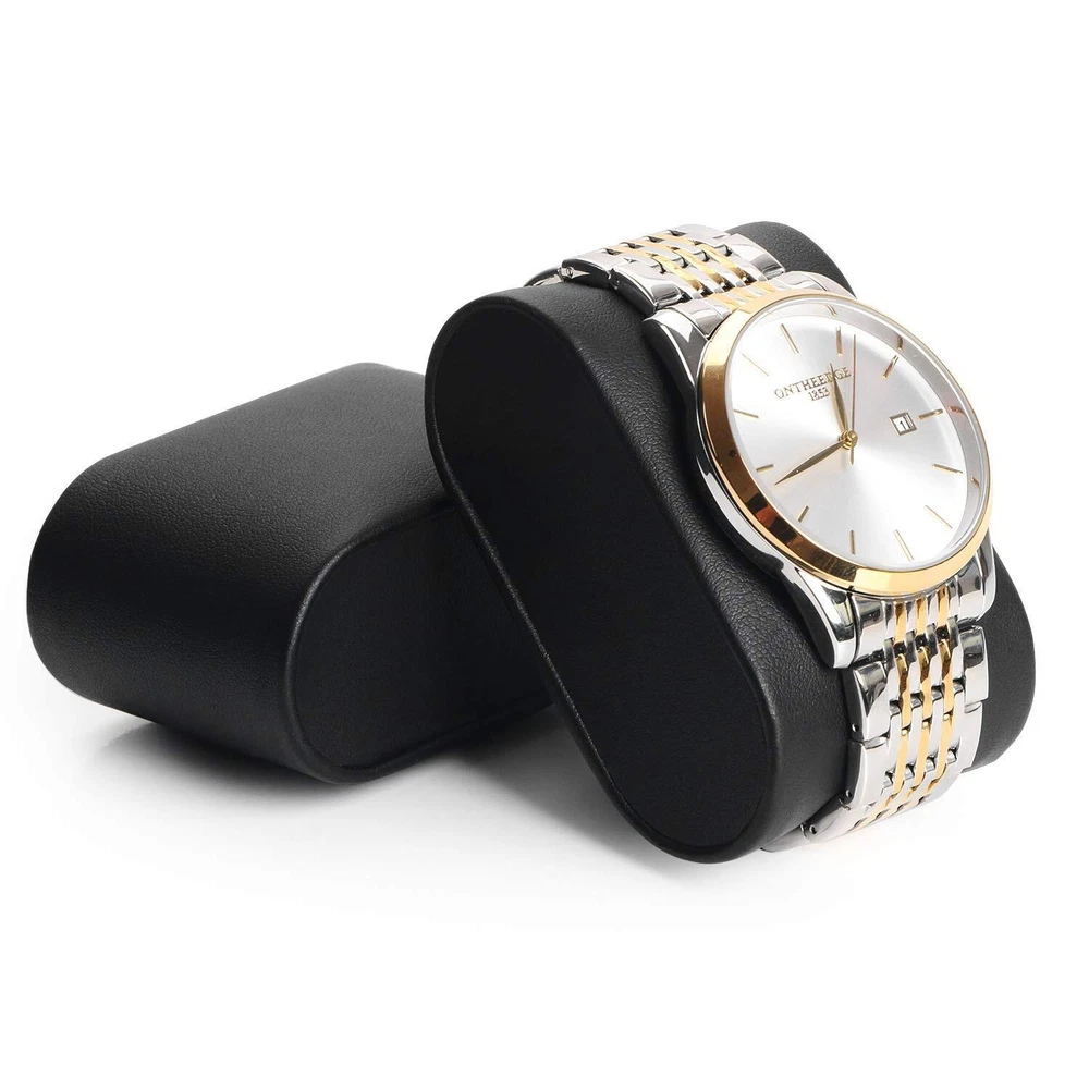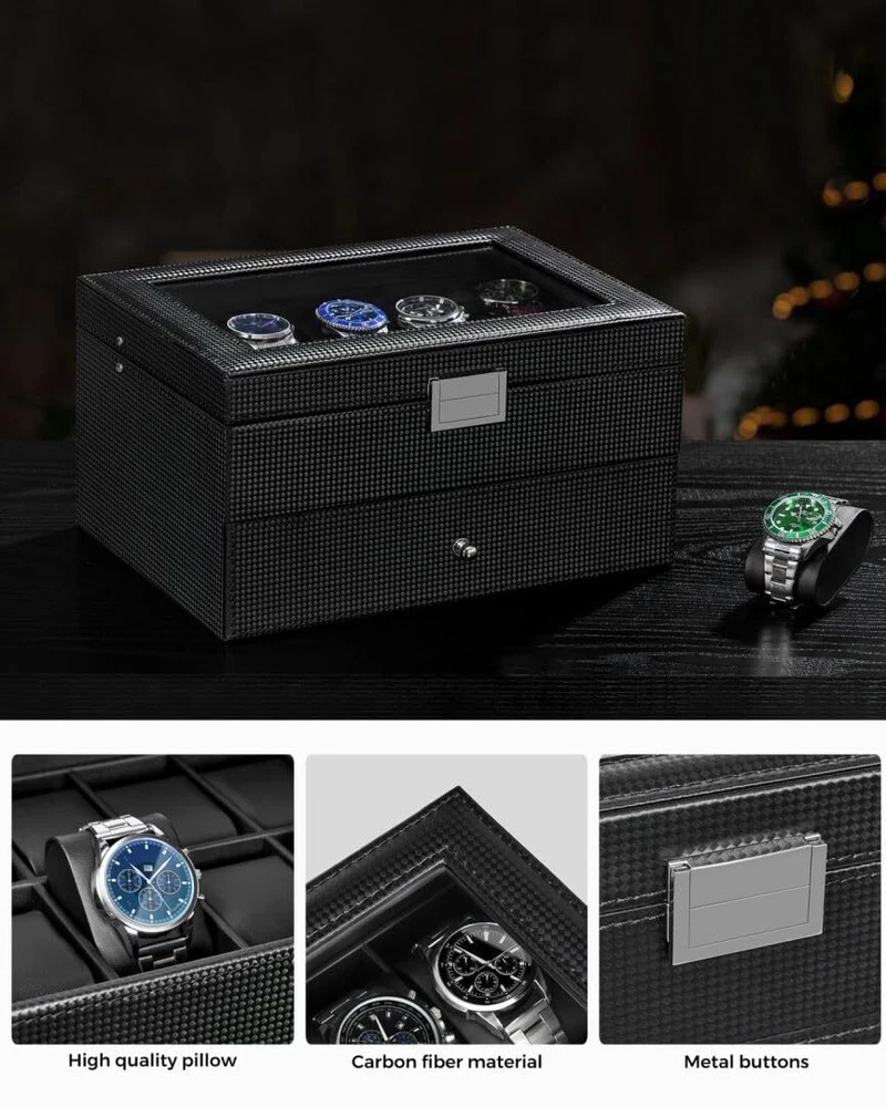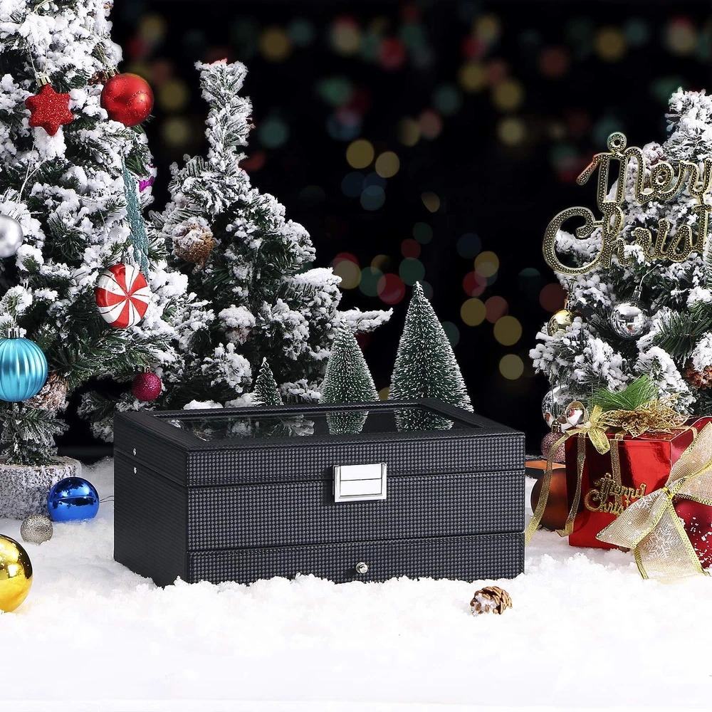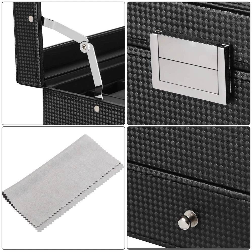 TOP-NOTCH QUALITY & CLASSY LOOK: Made from quality textured black carbon fiber cover, well-done seams, refined interior, smooth actual hinge, see-through real glass top, this well-built watch box is sturdy as well as elegant. The black color and sleek design can match the dresser perfectly. Your man must be very happy when receiving such a nice gift at birthday or Christmas WATCH & JEWELRY COMBO CASE: The first layer offers 12 sections to hold your watches, and the watch holders can be removed if you need upper tier space for other items. The bottom drawer provides additional storage for extra bands, rings, bracelets, tie clips, cuff links and other jewelry accessories. And the 3 main cases for the 2nd layer can be combined freely for showing the jewelry HIGH QUALITY PILLOWS & FIT FOR VARIOUS WATCH STYLES AND SIZE: Made of high quality PU and sponge cushions, indeformable & soft, protect your watches from dust, damp and shock perfectly. The flexible squares are large enough to fit men's giant wrists, but also pliable enough to accommodate women's daintier jewelry if need be. The size for each watch slot is 3.5"L x 1.7"W STURDY METAL HINGE & ONE HAND EASY OPEN BUCKLE: There is a sturdy metal hinge support instead cloth ribbon which helps to keep the top propped open. You can open and close it in seconds with one handed operation, very convenient and no time consuming CONVENIENT LARGE SEE-THROUGH GLASS WINDOW: Do you always tuck your watch collection away in a drawer or just let them sit around on desks everywhere? Have you felt frustrated to search all your place to find the watch you want to wear? This watch box, with real glass window, is able for you to see all the watches in the box and help you decide quickly which watch to wear. It will display all your watches in a convenient, fashionable and clear way