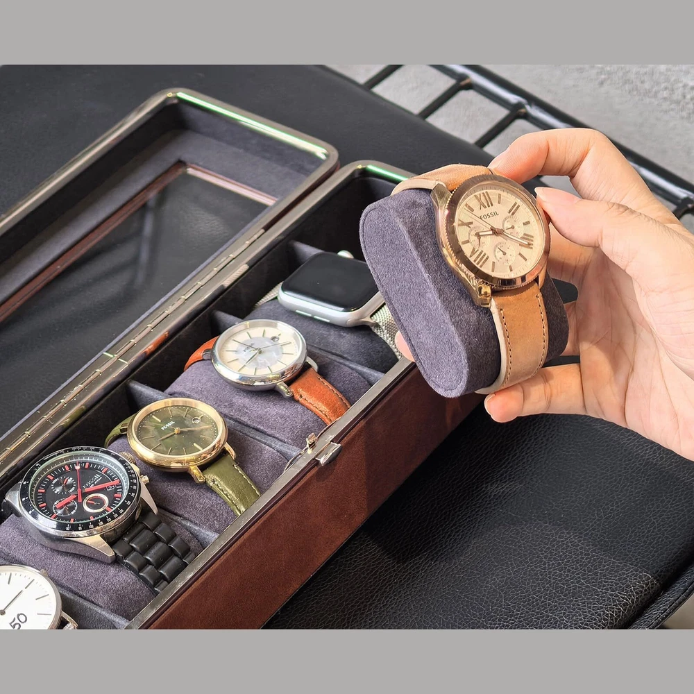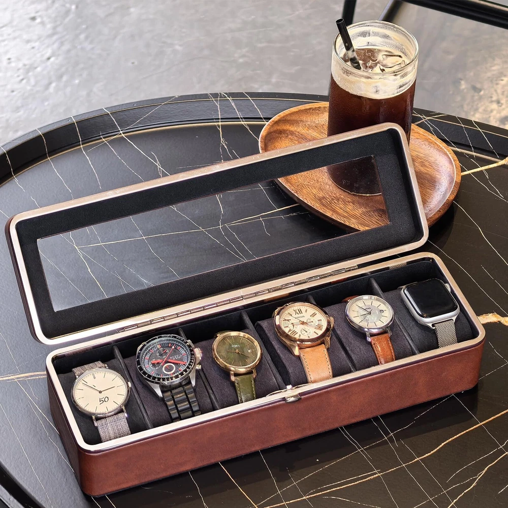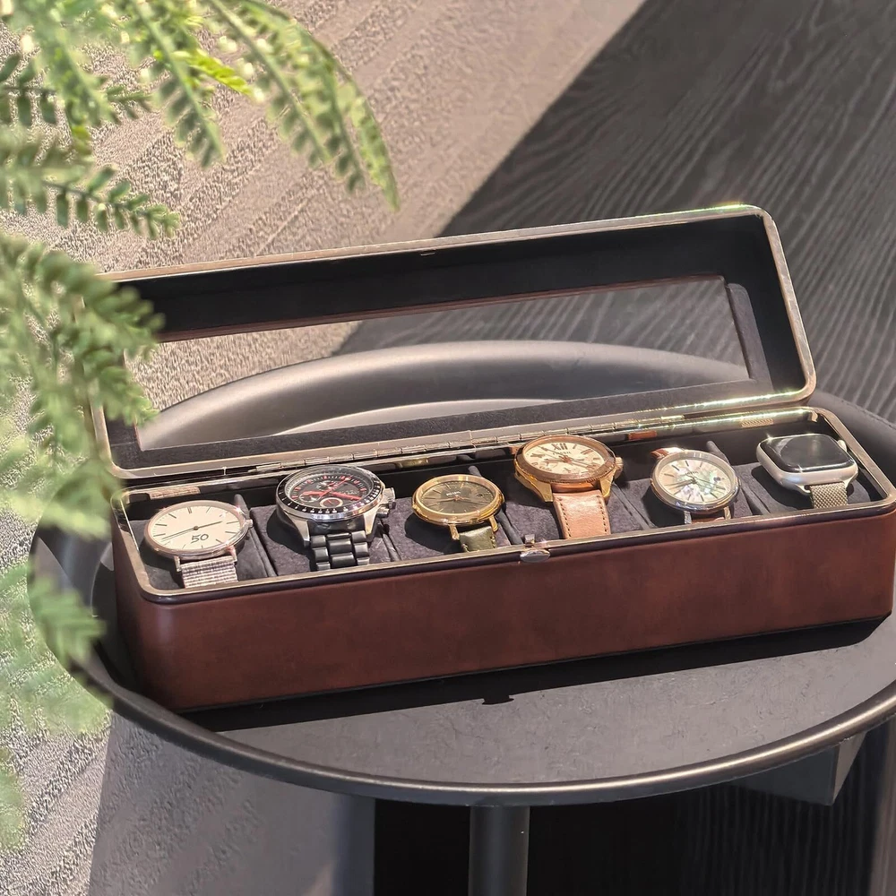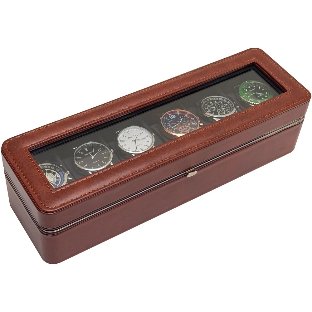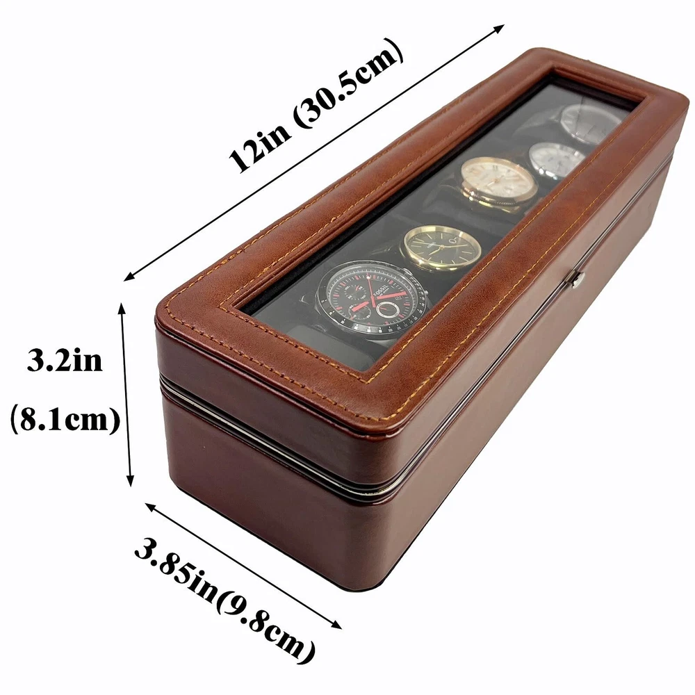 Product Size -Dimension:12"L x 3.85"D x 3.2"H (30.5 x 9.8 x 8.1cm) ; This 6 slots watch box organizer offers enough space for watches with a dial size up to 45 mm, keeping your watches organized and neat Glass Top - There is a glass window at the top for watches that need access to light and it will show the beauty of your precious watches, also you can see at a glance which watch you may decide to wear before having to open it Premium Material -The watch holder is with PU leather exterior and soft lining to protect your watch from scratches, super secure and is great for showing off, it will look great on your dresser Removable Pillow - Comes with 6 pillows that can be removed to make room for other accessories, such as cuff links, rings or other small items Great Present - This watch box organizer looks elegant and expensive, a nice present for people that who has a collection of watches, ideal for Valentine's day, Anniversary day, Birthday, Father's day, Graduation, Christmas Holidays etc.