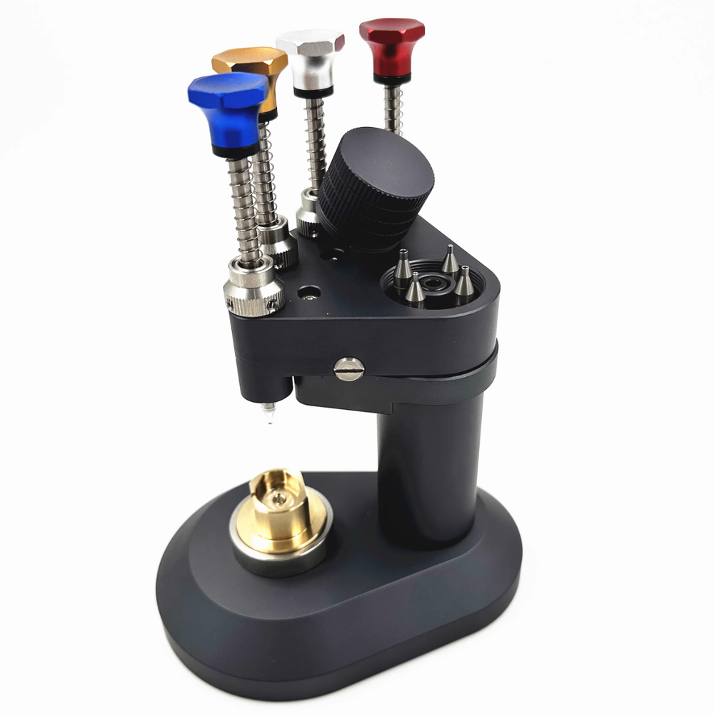 Watch Movement Pinning Machine for Four-Hand Movements Pin Pressing Tool Color: Black Grey Material: Metal, Steel, Acrylic Process: Oxidation, Sanding Style: Modern Mounting Type: Tabletop Mount Assembly Required: No Needle Tips Aperture: 0.6mm/0.024in+1.2mm/0.047in+1.6mm/0.063in+Solid Movement Bases Specification: 2035, 2824/2892, 3135 Number of Steel Needle Tips: 4 Number of Acrylic Needle Tips: 4 Number of Movement Bases: 3 Needle Shaft Length: 10.6cm/4.17in Product Size: 13.5*9.5*18cm/5.31*3.74*7.09in Package Size: 15*15*25cm /5.91*5.91*9.84in Gross Weight: 1.98 kg /4.37lbs Net Weight: 1.4kg/3.09lbs