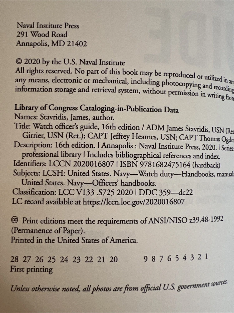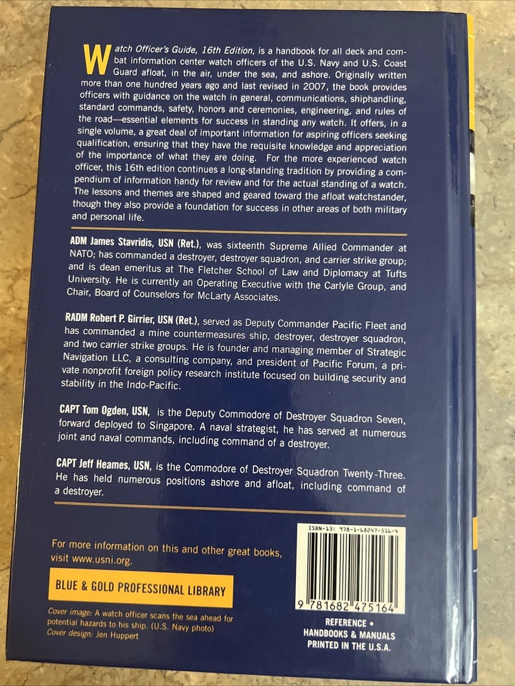 Watch Officer's Guide 16th edition by James G. Stavridis Hardcover Book is in very good condition only flaw it has some pages underlining in ink see pictures Pet smoke free home