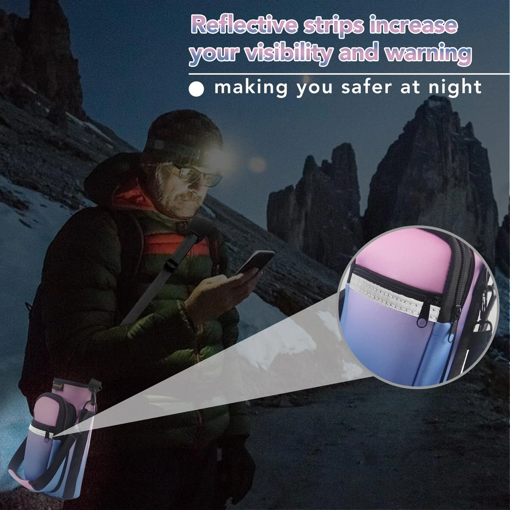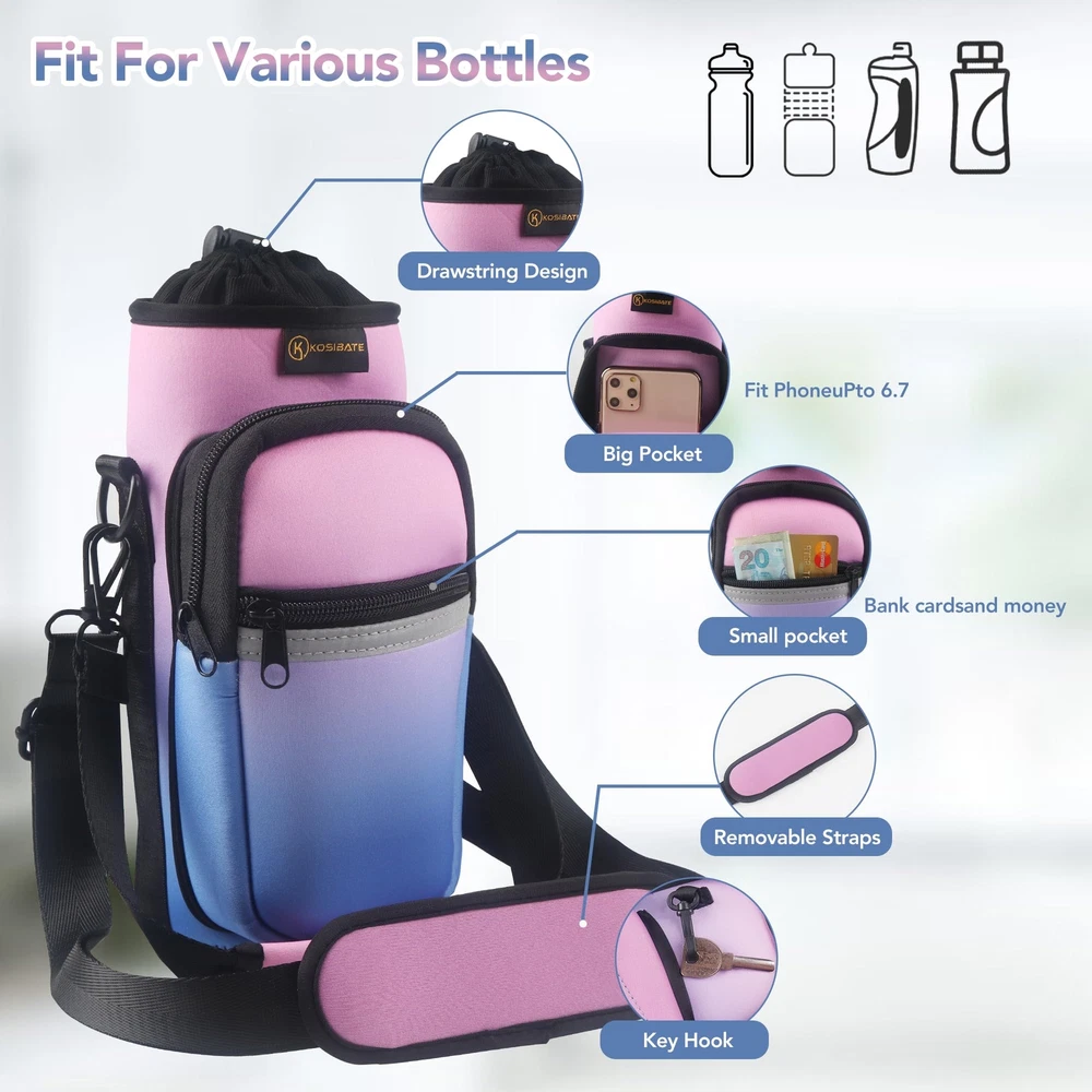 Premium Material: water bottle carrier bag is made of high quality neoprene material that protects your water bottle from scratches and scrapes, while keeping it highly soft and flexible, water resistant and durable Convenient to Carry: Our water bottle carrier bag comes with adjustable shoulder straps and a handle strap, making it easy for you to carry your water bottle with you wherever you go and making your travels more effortless Multi-Functional Design: This water bottle bag not only holds your water bottle but also has two additional pockets for storing your phone, wallet, keys, and other items, making your travels more convenient Suitable for All Occasions: Whether it's for outdoor sports, travel, hiking, or daily use, our water bottle carrier bag is an ideal choice Safety Assurance: We provide high-quality water bottle carrier bags, and if you encounter any issues during use, we will be dedicated to serving you and ensuring your shopping experience is worry-free
