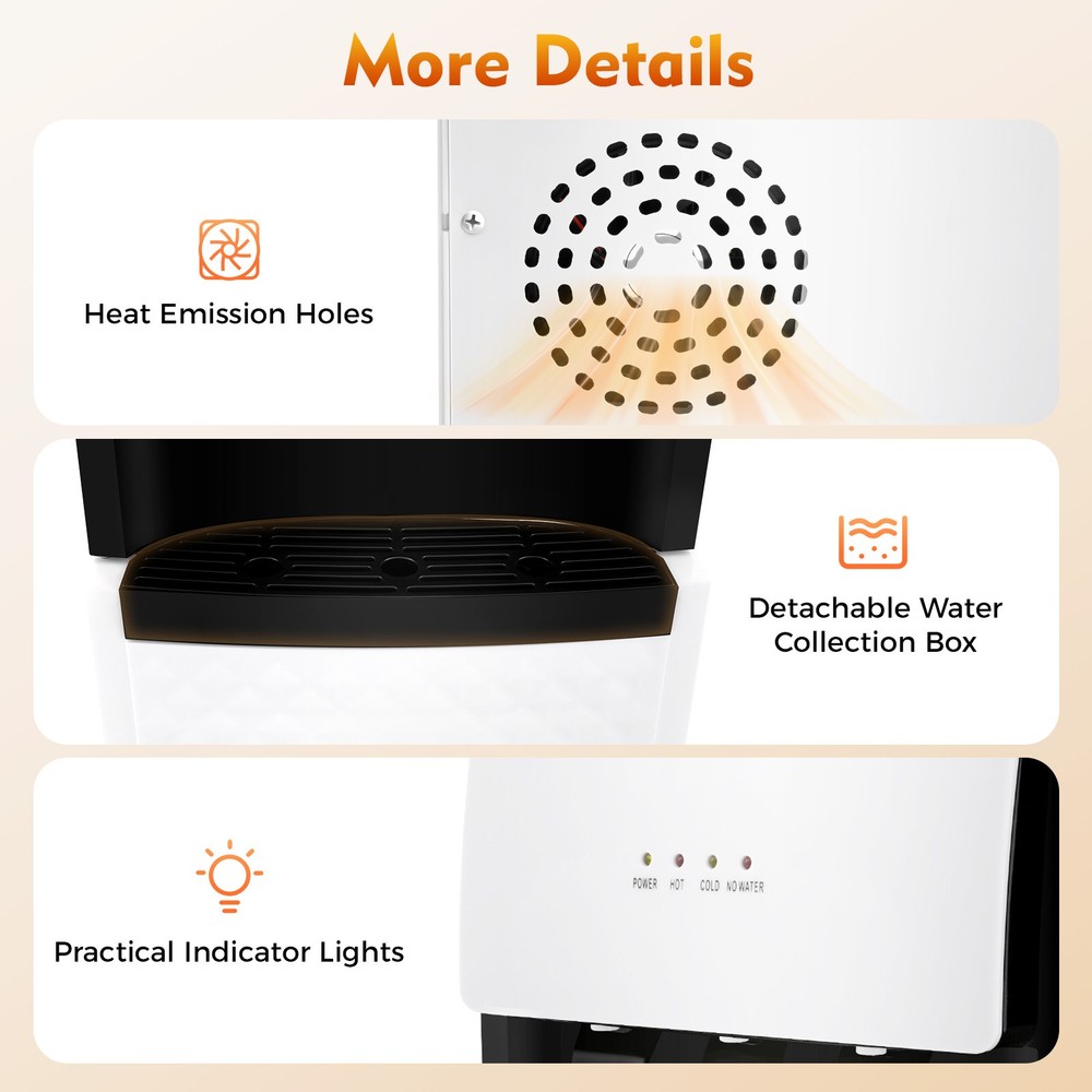 Product Description Description: This hot and cold water dispenser combines technology with humanized design to bring you a healthy drinking life. The unique lower water loading design makes it easy to change water. The appearance is stylish and simple so that it can show your high-end taste whether it is placed in the living room, office, or commercial places. The cold, hot, and room temperature water brings a hot and cold drinking water experience, which is energy-saving, safe, and convenient to use, meeting your whole family's drinking water needs. Details: Anti-slip Bottom: The bottom can effectively prevent the product from sliding or protect your floor from getting scratched. Indicator Lights: The indicator light panel is convenient for you to see the working status of the product (cooling, heating, water shortage). Detachable Water Collection Box: It can catch spilled water and prevent the wetting of the product or the floor while allowing for easy cleaning. Specifications: Color: White Material: PP Process: Electrostatic Spraying Plug Type: US Standard Voltage: 110V Mount Type: Floor Standing Assembly Required: No Water Cooling Power: 75W Water Heating Power: 500W Cold Water Capacity: 1.5L/0.53Gal/H Hot Water Capacity: 5L/1.32Gal/H Cold Water Temperature: 5-10℃/41-50℉ Hot Water Temperature: 85-95℃/185-203℉ Power Cord Length: 1.5m/4.92ft Product Size: 31*29.5*92.5cm/12.2*11.61*36.41inch Packaging Size: 98*34*33cm/38.58*13.39*12.99inch Gross Weight: 8kg/17.64lbs Package Included: 1* Bottom Loading Water Dispenser 1* English Operating Manual Notes: To ensure the normal operation of the machine, the machine has been tested before leaving the factory, so the product received may have residual water after the test, which is a normal phenomenon. Payment Delivery details Terms of sales About us Contact us Payment We accept ebay payment 。 Fees such as import duties, taxes are not included in the item price or shipping costs. These charges are the buyer's responsibility. Delivery details Shipping: 2-9 working days to: USA Terms of sales We maintain high standards of excellence and strive for hundred percent customer satisfaction. Feedback is very important to us. We hope that you contact us immediately before you give neutral or negative feedback, so that we can address your concerns. It is impossible to address issues if we do not know about them! About us Your satis faction is our ultimate goal. We work hard to earn your trust and future business. Our certified technicians have tested each item before shipping. The unit comes with 1 year limited warranty on all manufacturing defects. a) If you receive a defective item, you may return it or ask for a discount. Please contact us within 14 days after you receive the package. b) What you returned must be intact and in its original packaging as re? u. Customer is responsible for shipping costs of the returned item. c) We will cover the cost of shipping back t with the shipping rate indicated in the registration page. We will send you a new unit or refund the full payment you paid. Thank you. Contact us Business Hour Business Hour: Monday To Friday: 8:30 AM to 5:00 PM (Beijing China time) Due to time zones, our reply to your questions may not be immediately. But within above working time, we will reply your email within 24 hours. If it's non-workdays, please kindly be patient and wait till Monday. Please contact us with ebay message. Please feel free to contact us if you have any questions. Monday To Friday: 8:30 AM to 5:00 PM (Beijing China time) Due to time zones, our reply to your questions may not be immediately. But within above working time, we will reply your email within 24 hours. If it's non-workdays, please kindly be patient and wait till Monday. Please contact us with ebay message. Please feel free to contact us if you have any questions.