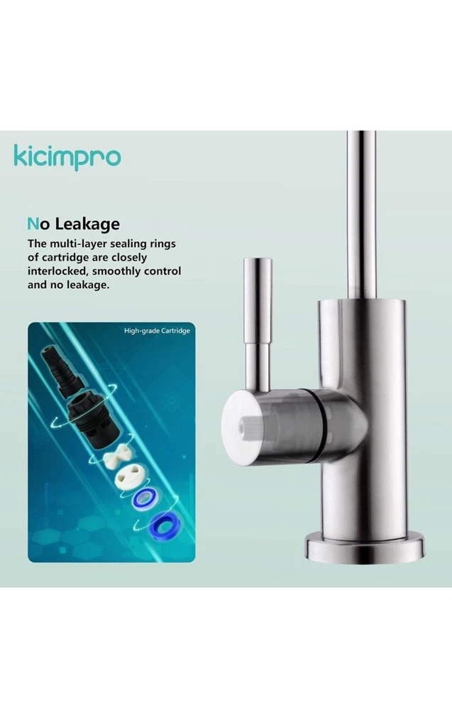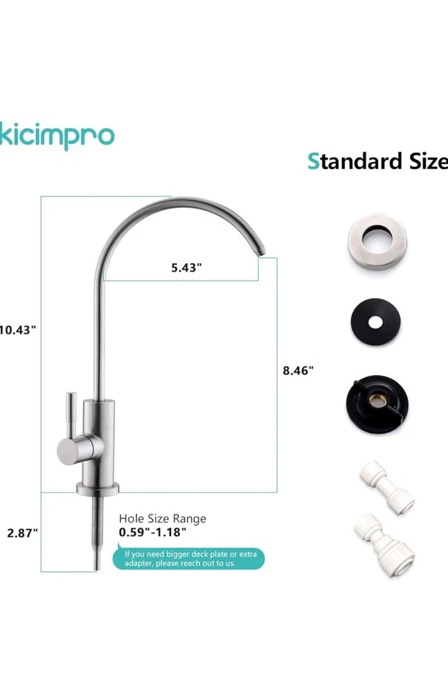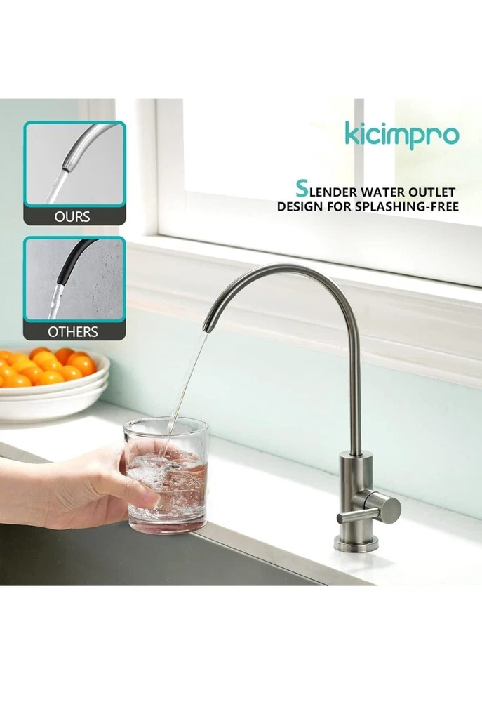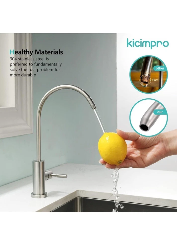 Open box New item! No Splashing: The slender water outlet design and reasonable camber for the water filter faucet make the water in the center, and the water is soft and centralized without splashing, meeting the daily water needs of the family. Healthy Drinking: Healthy materials for reverse osmosis faucet is selected to ensure the safety. The whole process of water passage keeps your water clean all the way from the filter to the spout of drinking water faucet for kitchen sink. Drink healthy water and stay away from inferior sink filter water faucet to enjoy your healthy life. No Leakage: Drinking water faucet high-grade cartridge with excellent sealing, tested before leaving the factory to ensure no leakage and no dripping. Exceed industry longevity standards to assure smooth handle operation. Healthy Materials: RO faucet made by SUS304 stainless steel that is lead-free and never get rust. The all-metal body is for maximum durability. The sink water filter faucet is made of food grade SUS304 stainless steel material. It is the best choice for family health especially kids. Standard Size: Kicimpro filtered water faucet, fitting 0.59 inch to 1.37 inch kitchen sink holes, can be used with RO water purifier, sink water filtration, kitchen, RV to meet different needs. Provide 2 kinds of quick connectors (1/4" and 3/8") to meet your various installation needs. You can also reach out to us for special needs(extra adapters or bigger deck plate).