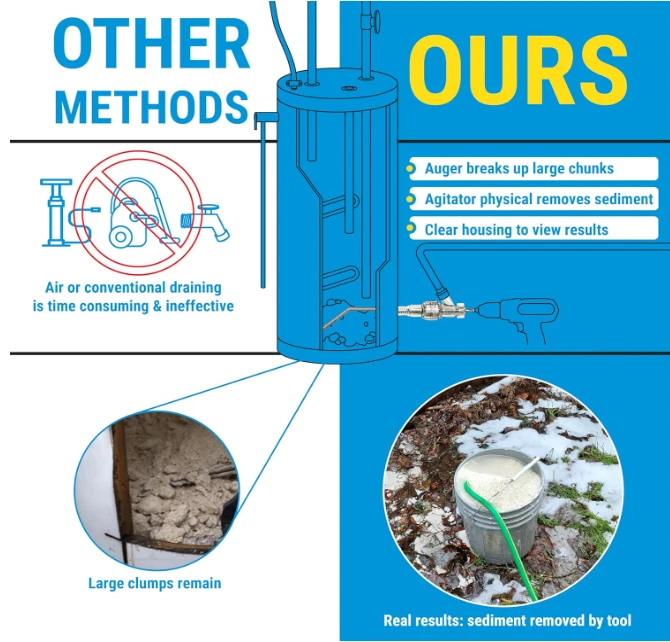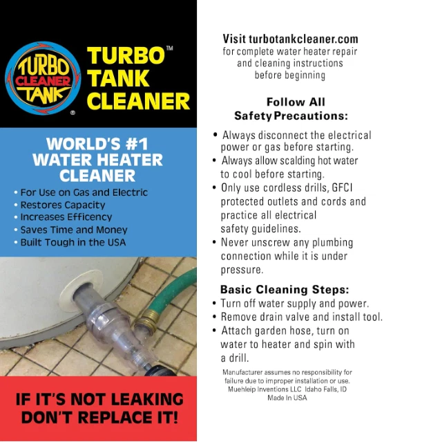 Water Heater Cleaning Tool, Improves Hot Water Supply, Removes Hard Water Sediment, Flushes Gas & Electric Tanks, Pro-Grade DIY Solution MULTIPLE BENEFITS – Extend the lifetime of your water heater, improve its efficiency, reduce your energy bill, and increase your hot water supply. This tool pays for itself in one use! WORKS GREAT – Other flushing methods only remove small loose sediment particles where the Turbo Tank Cleaner physically breaks up the large sediment deposits collected at the bottom of the tank. UNIVERSAL – Cleans all water heater tank types, gas and electric (not for tankless water heaters). CLEAR HOUSING – This allows for full visibility during the sediment removal process. QUICK AND EASY – Install through the tank's drain valve hole, no need to drain the tank, and works with any cordless drill and standard garden hose. DURABLE – Several iterations have been made to improve the ruggedness of the tool. This includes upgrading the housing to an impact resistant polycarbonate plastic (1/28/2023). ENGINEERED FOR PROTECTION – Features a lightweight, smooth spring agitator designed to shield the water heater's essential parts. Effective at low drill speeds, ensuring the dipping tube, heating elements, and tank lining remain unharmed.